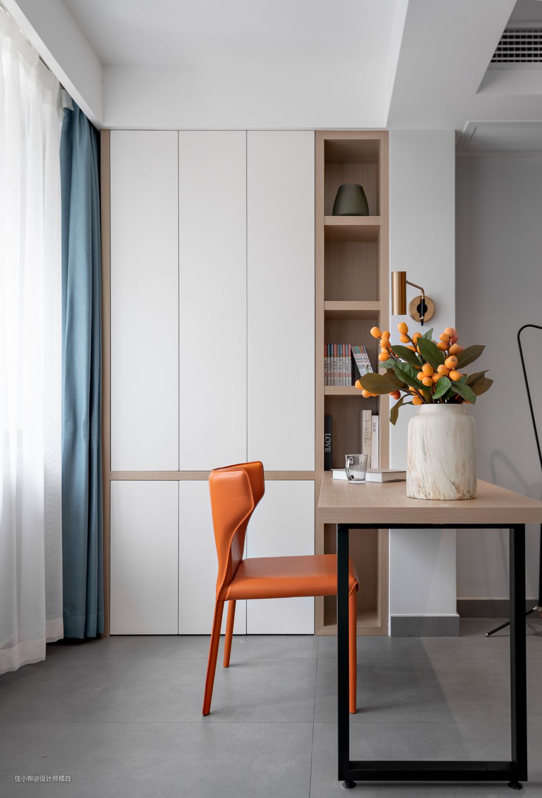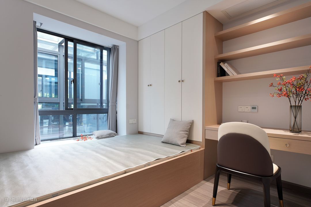 次卧设计成了榻榻米+书房的形式,床侧刚好放下一张小型书桌,上方做了装饰性层板,可以放置少量书籍或装饰摆件等。