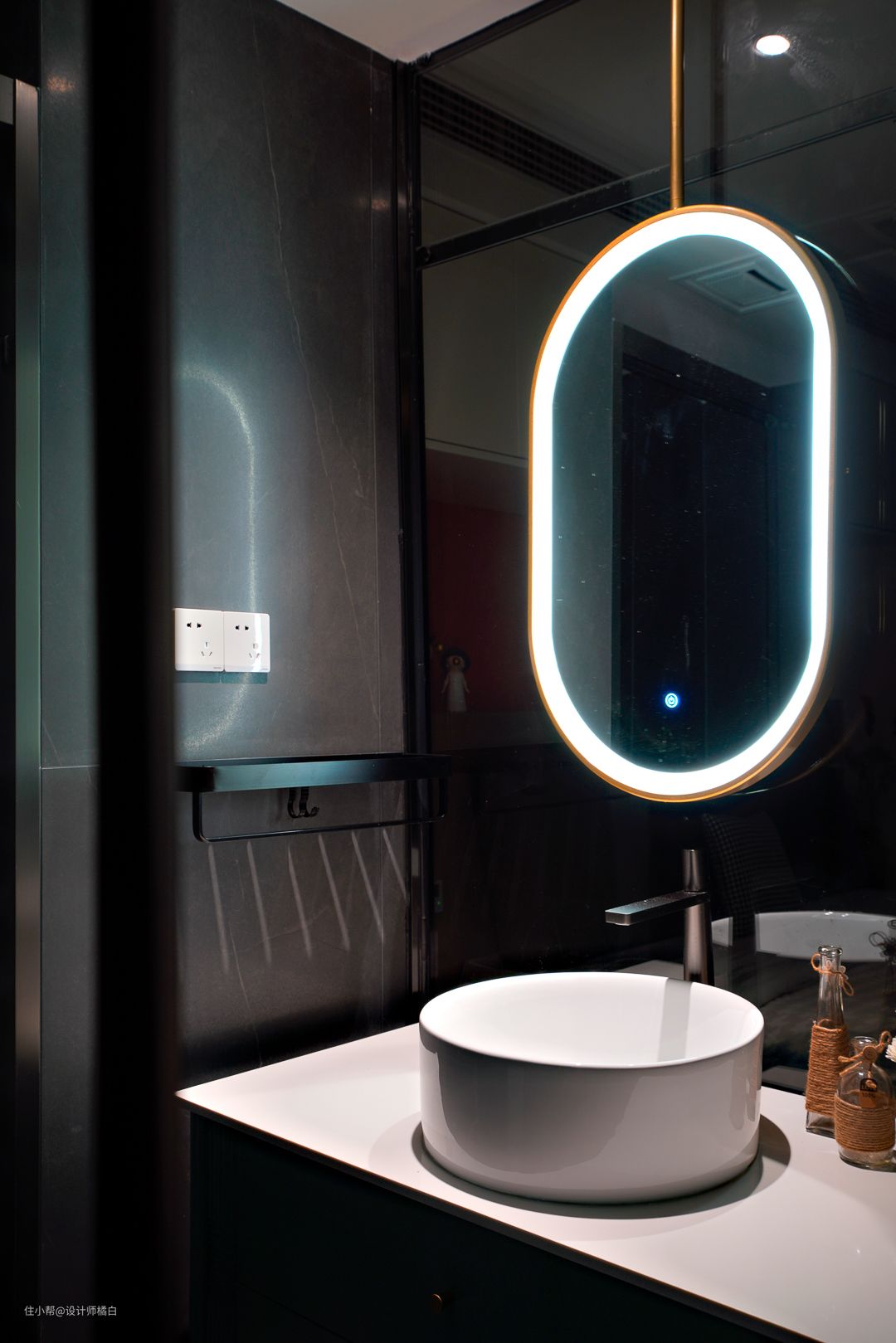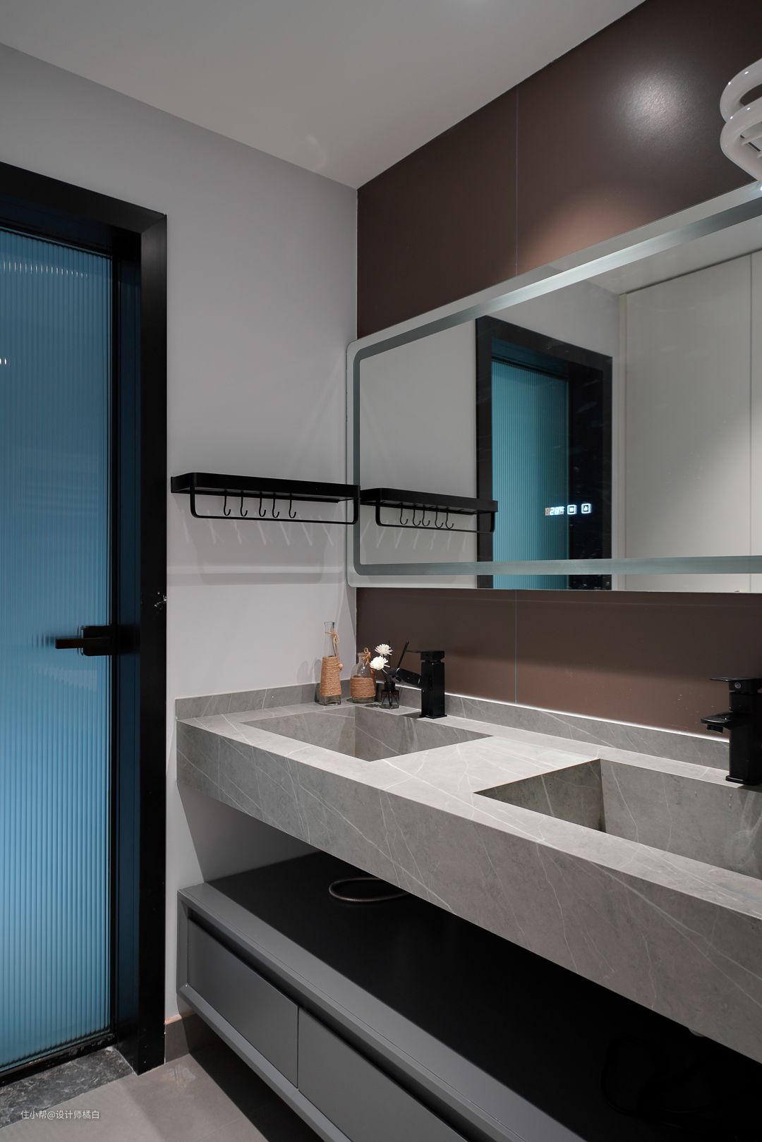 卫生间采用深色系打造,整个空间整洁大气。功能充足的情况下,布局工整有序,简约低调又极具质感,极大提升了家居生活的幸福指数。