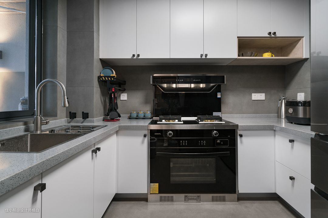 厨房操作台面采用了空间利用率最高的U型布局。此外,双层定制柜体增加收纳之外,根据尺寸内嵌厨房电器,将立面利用最大化。
