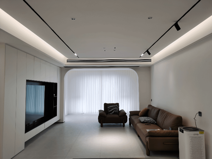 客厅吊顶以简洁为主,做了无主灯设计——吊平顶,嵌入筒灯和磁吸灯,局部做了隐藏灯带,让空间的灯光富有层次和现代感。