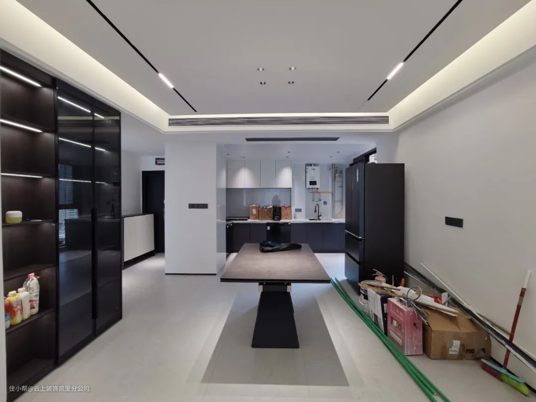 餐厅旁边定制了到顶的玻璃推拉门餐边柜,而且每一层都配上了灯带,实用的同时看上去也十分轻盈通透。