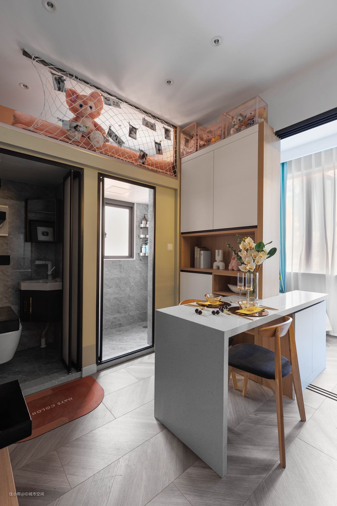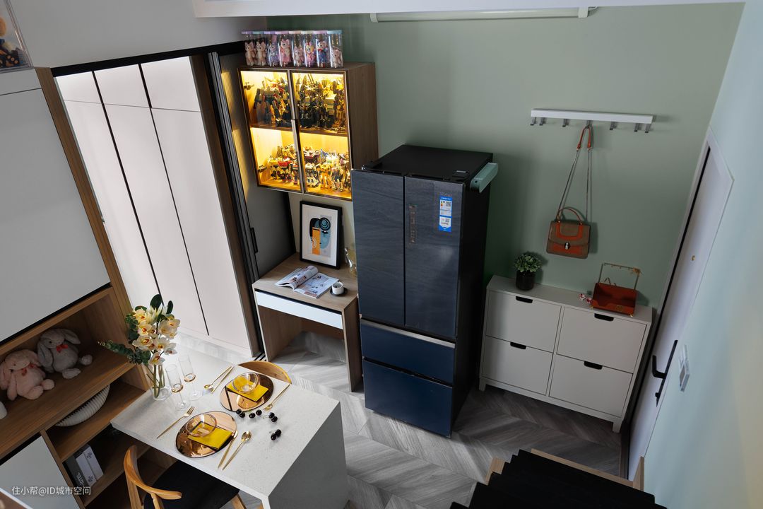 楼上的视角,麻雀虽小五脏俱全,整个房间的中心位是一个大操作台,也可以当餐桌使用,并且考虑到室内空间比较局促,将一个柜子做成了隔断,分割出了卧室和厅。#客餐厅一体#现代简约#LOFT#小户型#老房改造#ID城市空间