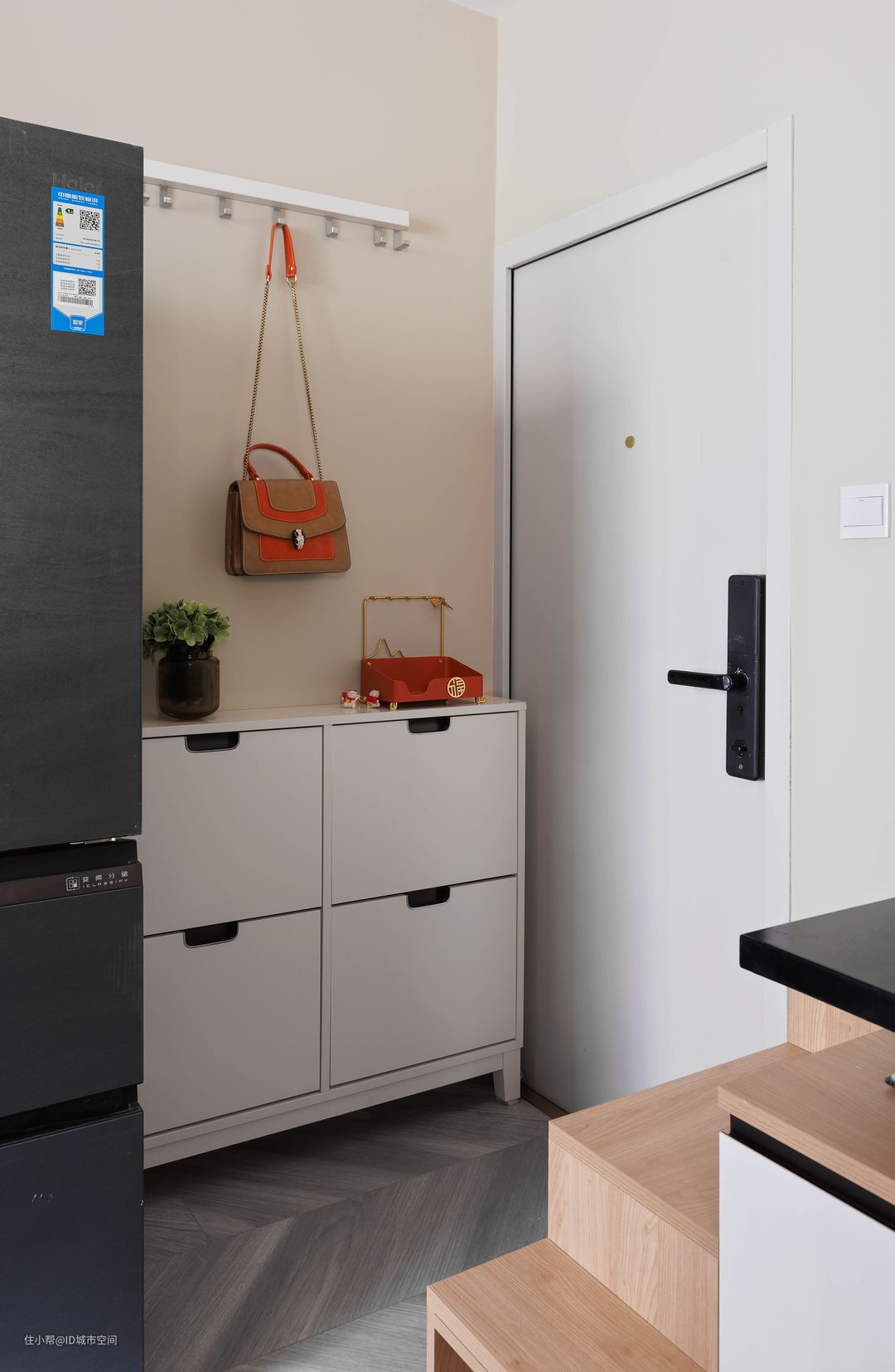 进门利用挤出来的空间设计了单独的鞋柜,方便一家人进出门换鞋,鞋子收纳上也是够用的。#现代简约#LOFT#小户型#老房改造#ID城市空间