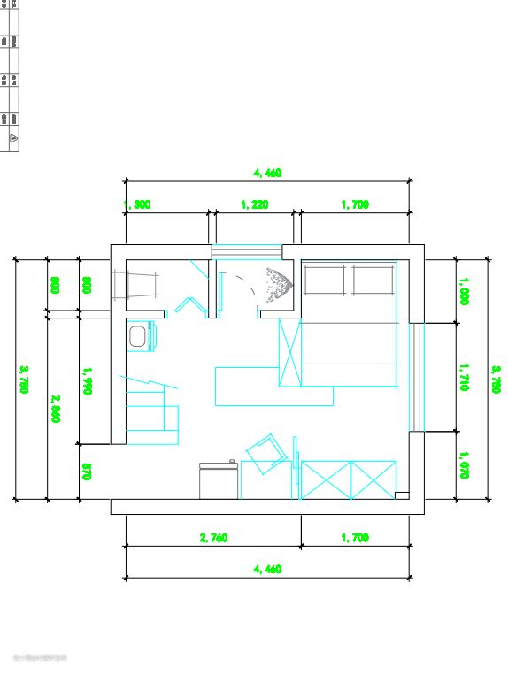 原始户型平面图: 原始胡扯室内空间进门压抑,吊柜部分几乎要碰头,厨房和卫生间没有很好的分隔开,卫生间功能分区拥挤,没有很好的使用空间,室内空间分割不明确,没有区分开休息和公共区域,也无法满足两代人的生活需求。