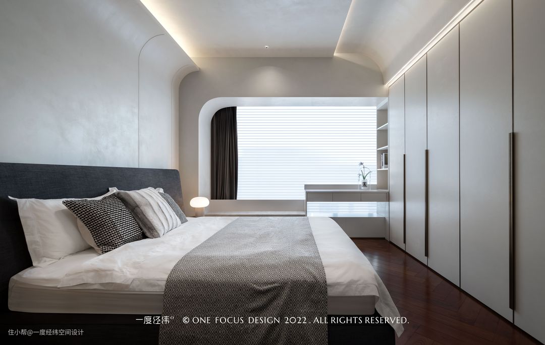 主卧天花做了弧形的造型与天花层次,飘台上方天花做了半径500的弧度。一整排白色定制烤漆柜满足各类衣物的储存。