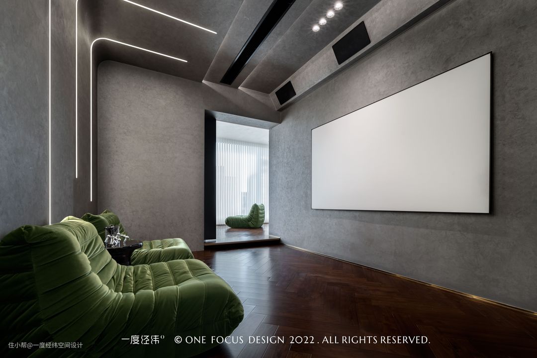深色系的风格与其他空间形成强烈鲜明的视觉对比,暗色让观影体验更加完美,天花上的发射性LED灯则提升了观影空间的质感与格调。