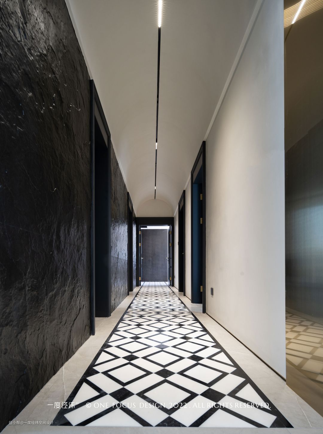 以经典的黑白色调,廊道采用弧形的墙体将大空间划分为功能独立的小空间,不仅有过渡空间的作用,还为空间流转增加情绪层次。