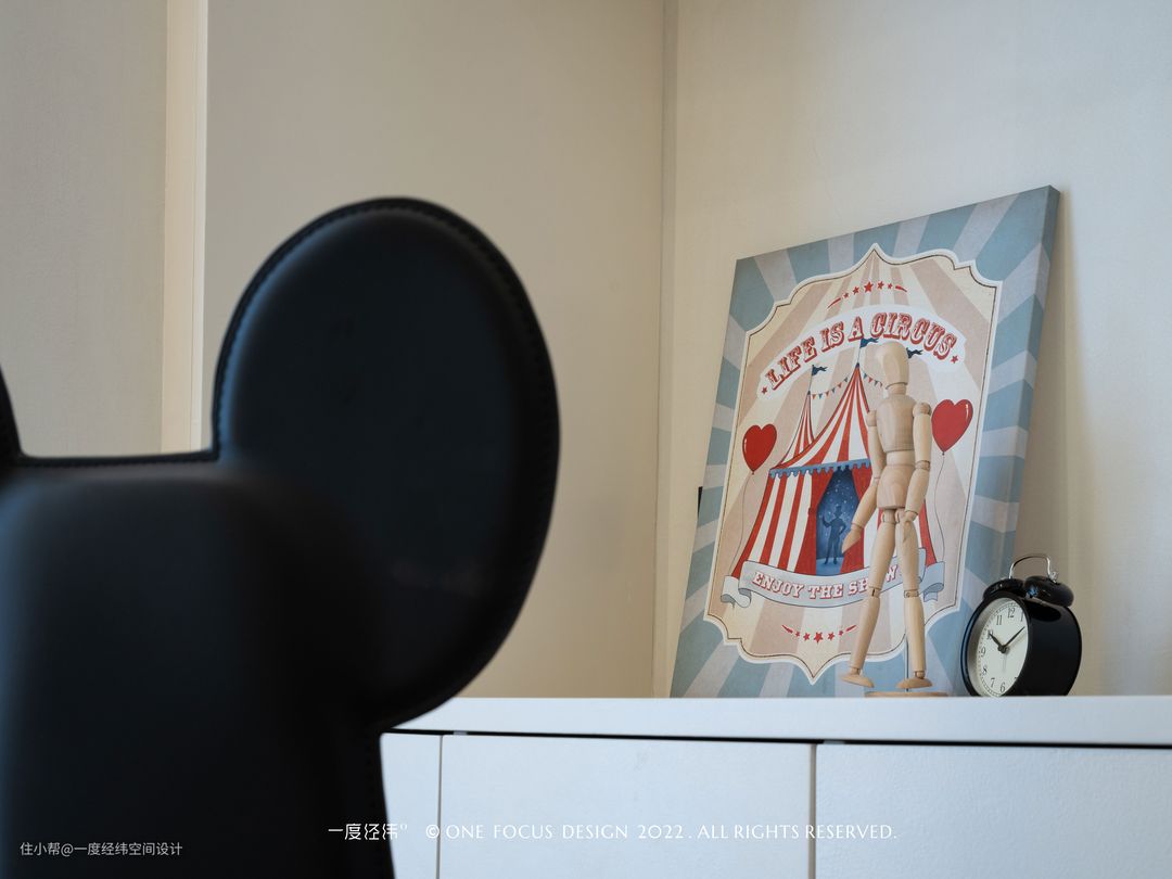 白色的婴儿床、米奇元素的椅子以及马戏团挂画充满童趣与时尚,童话乐园直达孩童的内心。