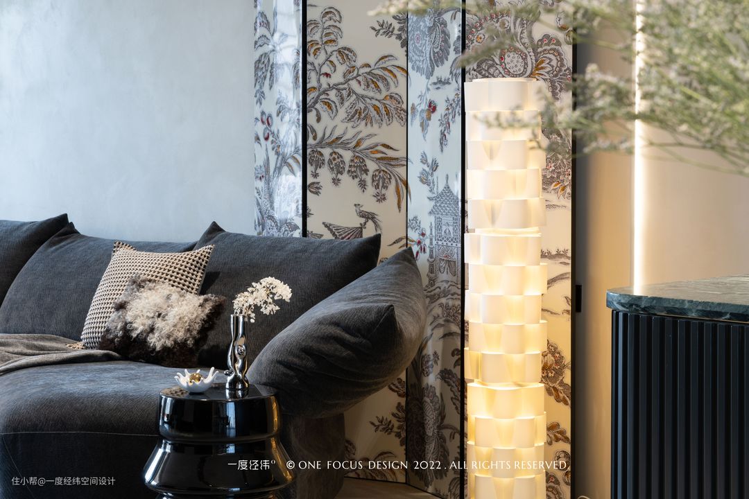 这样搭配在房子点缀到极致!灰黑色的edra花瓣沙发(尺寸:320cm*265cm)、宜家异型落地灯、黑色的茶几、网红的若奈漆木屏风搭配,营造一种高级的低奢感。