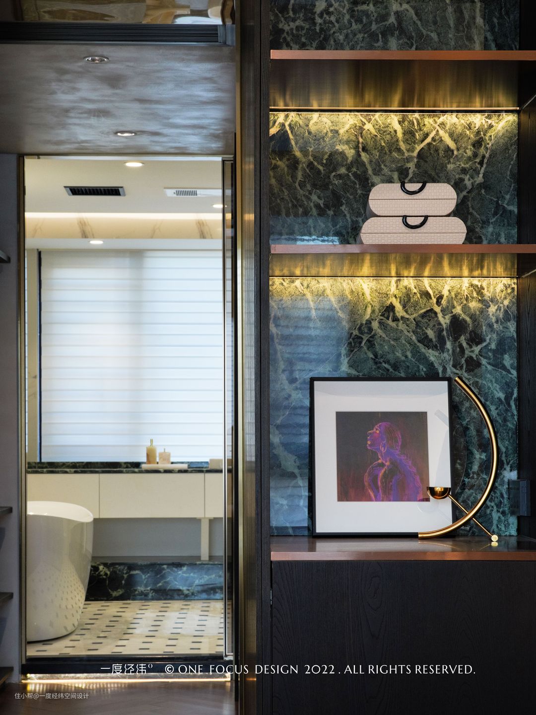 铺贴墨绿色的大理石岩板,台面运用香槟色的不锈钢层板,黑棕色的定制柜体即可作为展示空间也可作为小吧台供两夫妻平日品酒。