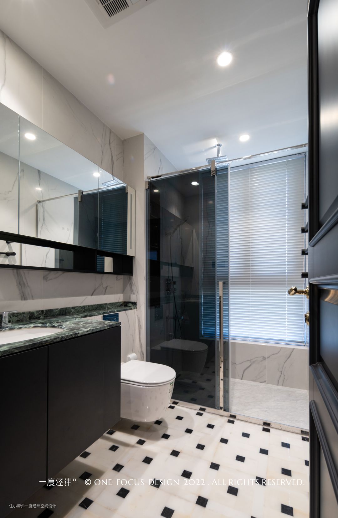 主卫△ 主卫整体以白色为主,墙面铺贴大理石瓷砖,地面大面积干区使用花砖,淋浴区则用不同的浅灰色大理石瓷砖区分干湿区域。洗手台台面用墨绿色纹理的大理石岩板台面与白色的柜体搭配,打造大空间而舒适的卫生间。