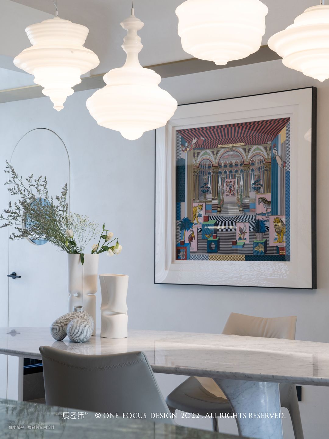 餐厅墙面上爱马仕丝巾装裱挂画,圆弧形定制餐桌、别致的吊灯造型更是点睛之笔。