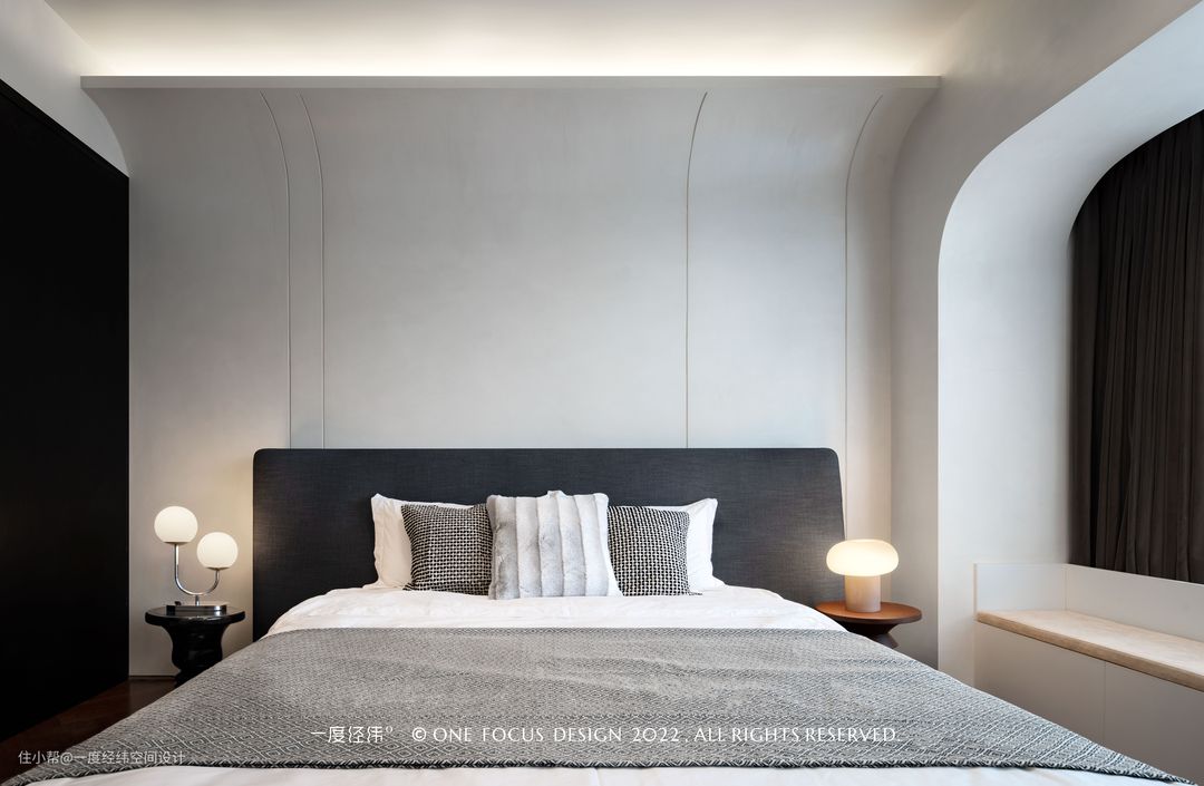床头背景不仅做了弧形的造型墙面,也在墙面上做了3厘米的凹缝线条,在天花与造型之间暗藏LED灯带。蓝色的软包与白色的床品居者打造一个舒适惬意的休憩空间。