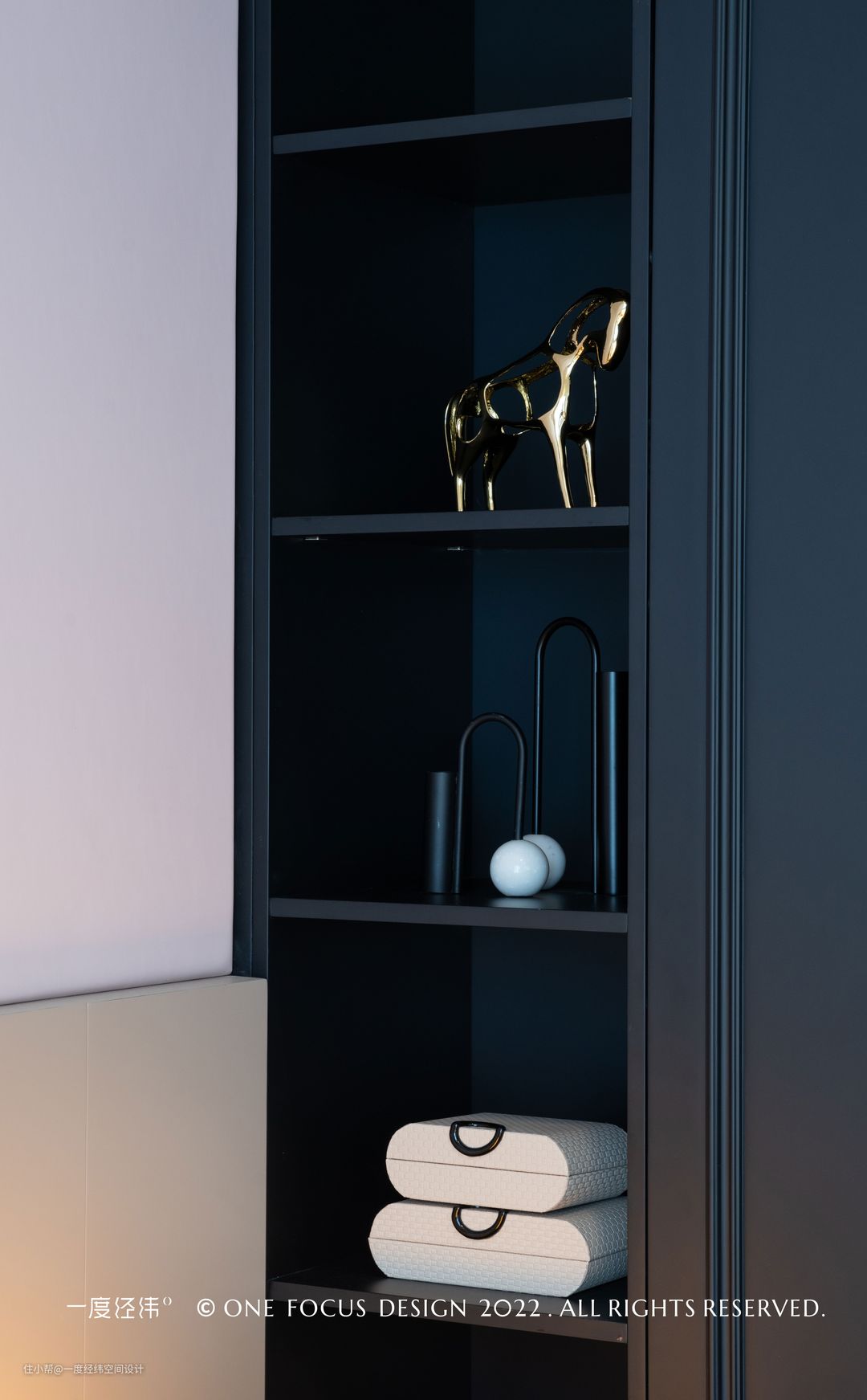 烤漆定制柜开放格放置摆件与首饰盒,突显了主人的品味与生活品质,让到访的客人也能感受到宾至如归。