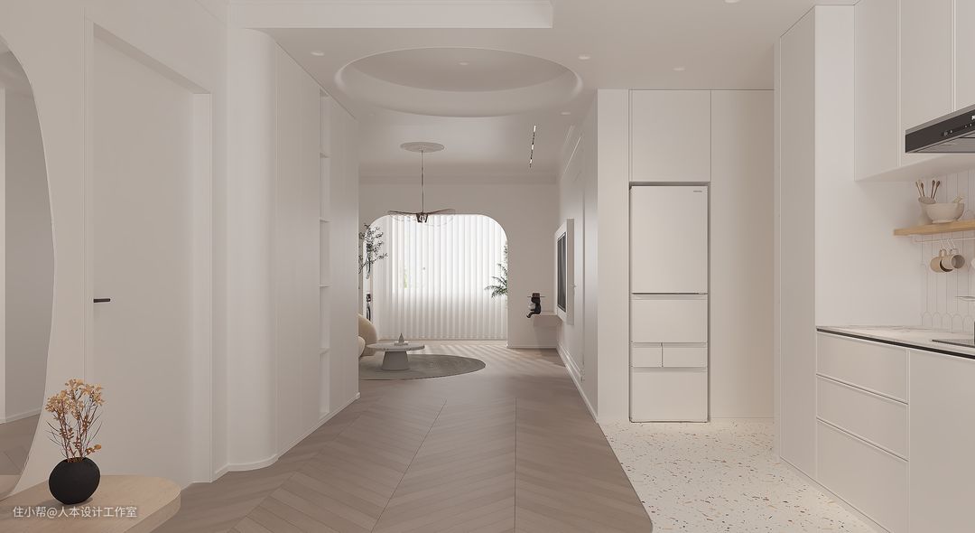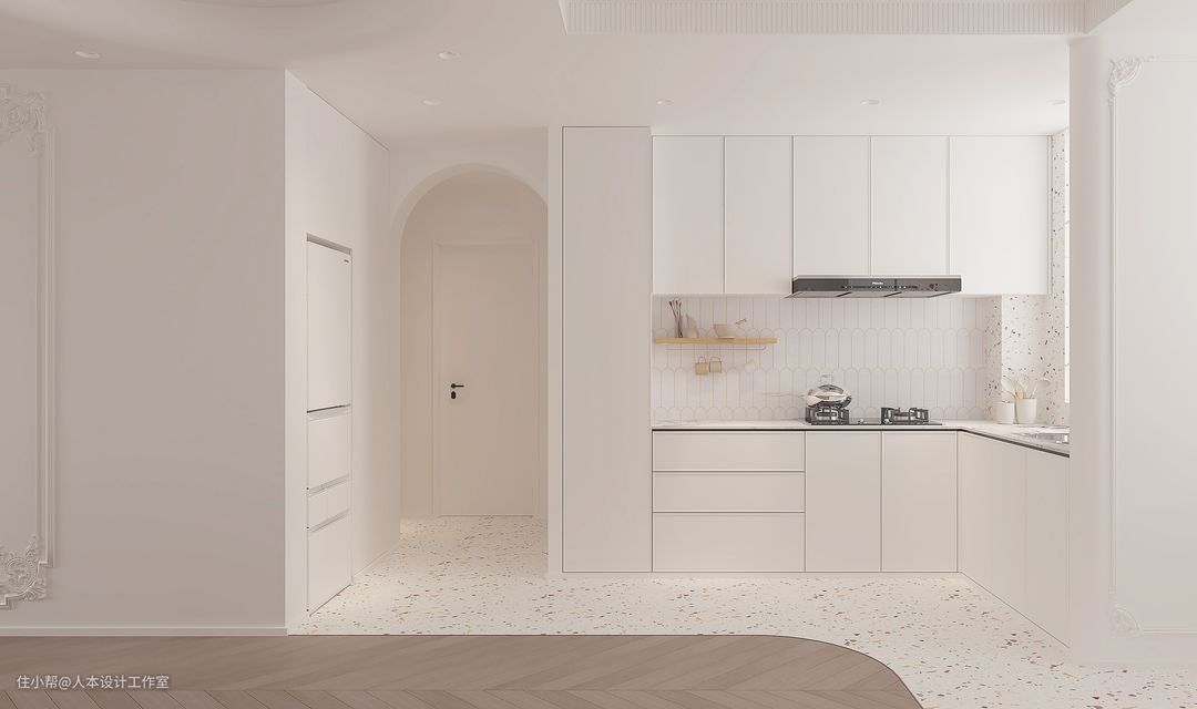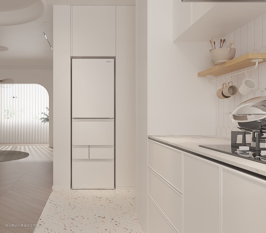 本案中餐厨区的设计是屋主最心仪的部分,我们把原有的小厨房打通,做成了开放式厨房,整个空间显得宽敞完整了不少,白色橱柜与花砖,简约又浪漫,地板和水磨石之间使用大弧形进行分割,一来顺应餐厨功能区的区隔,二来为空间增添了不少的柔美气质。 在这样纯净温和的空间中,选择一款能够完美融合的冰箱非常重要,我们为业主推荐了东芝芝味系列GR-RM495WE-PG1B5晴空白冰箱。事实上这款一直是我们心中的百搭冰箱,搭配我们所擅长的浅色系简约风格总是合适,如果客户的餐厨空间较小,也不用担心这款冰箱太占地,而且它还在用心解决小户型用户头疼的储物难题。这款冰箱采用的隔热材料更加薄,使其比其他品牌的同体积冰箱更能装,真正的“皮薄馅大”,尤其是在当今社会,这样一款冰箱真的会深得业主的心,再也不用过多操心食材过快变质等问题。