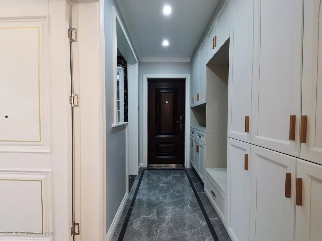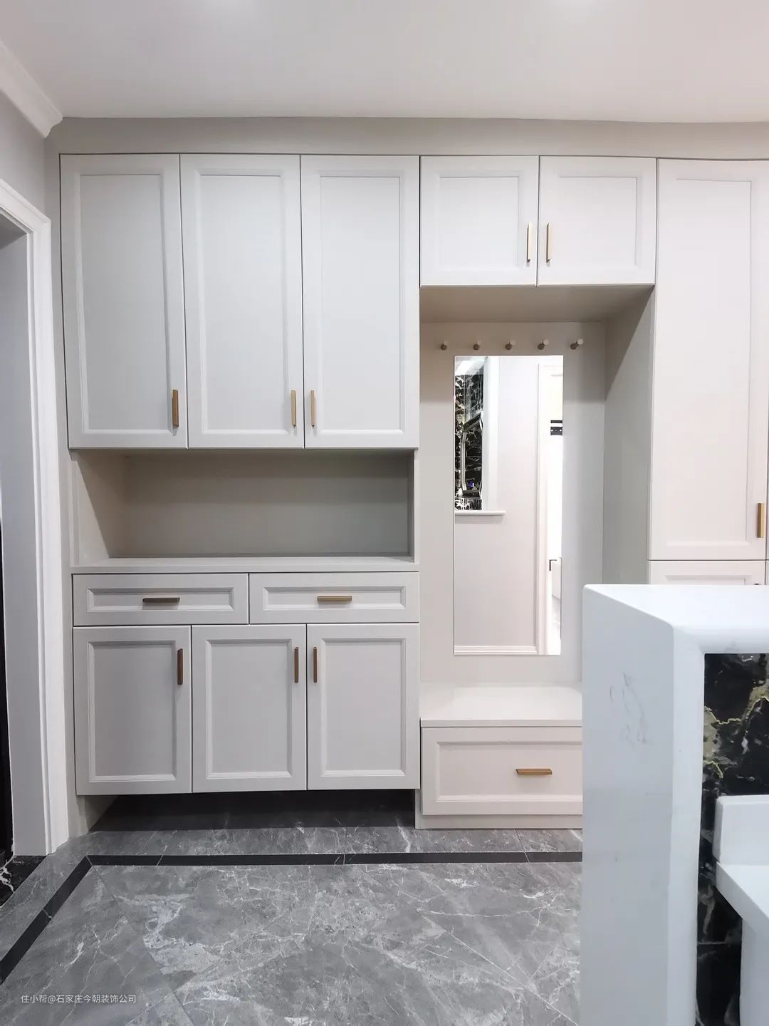 一整面3.3米长的玄关收纳柜,合理分区,小物件、当季换季鞋子、穿鞋区、次净衣、生活物品都被合理安排。