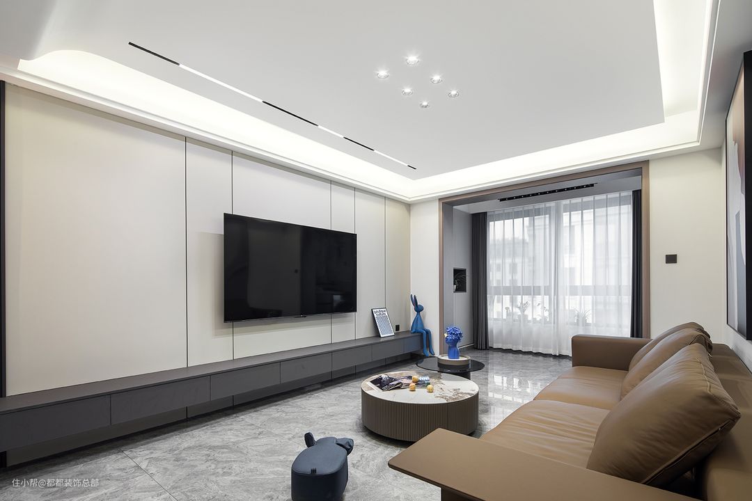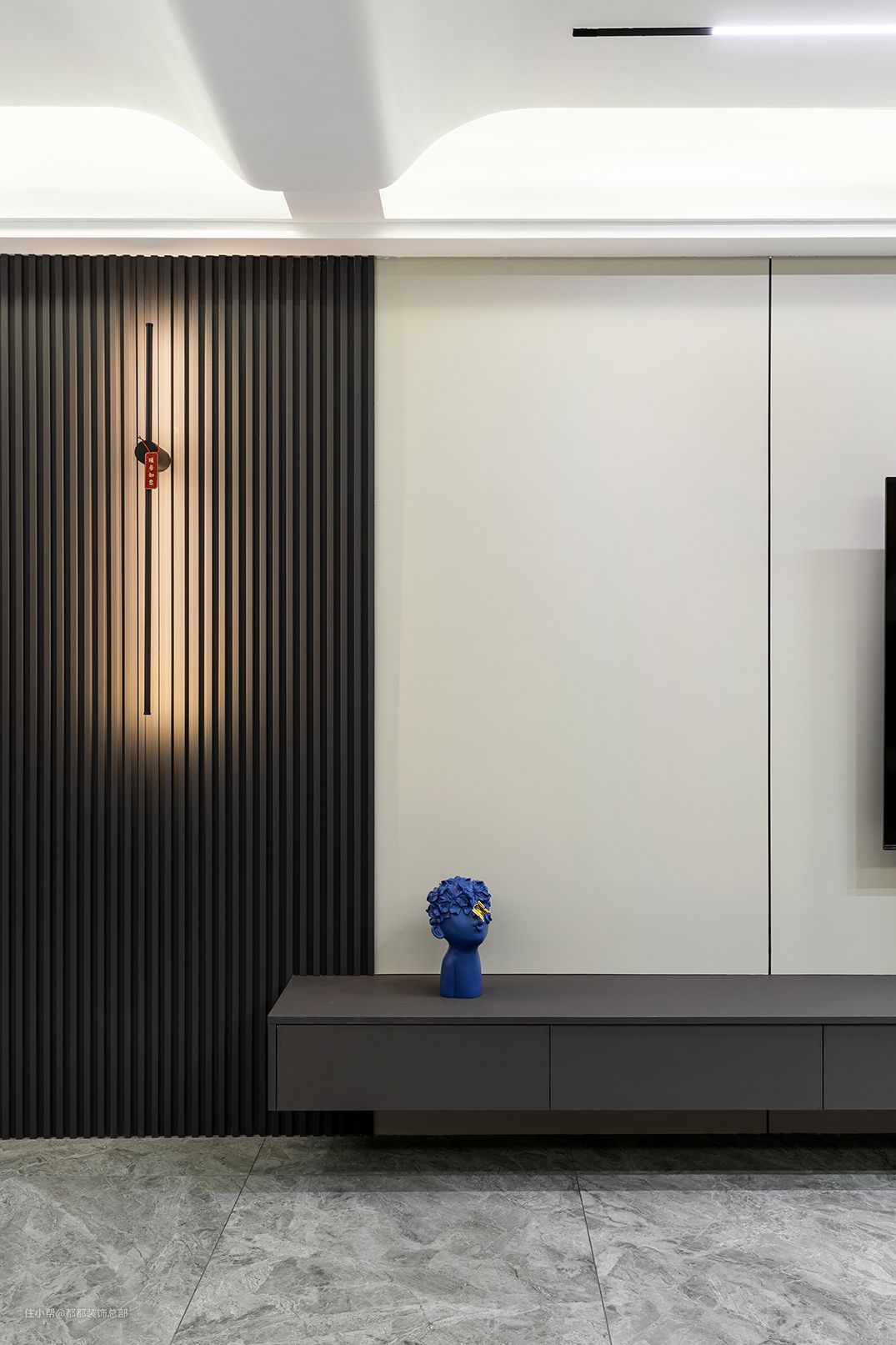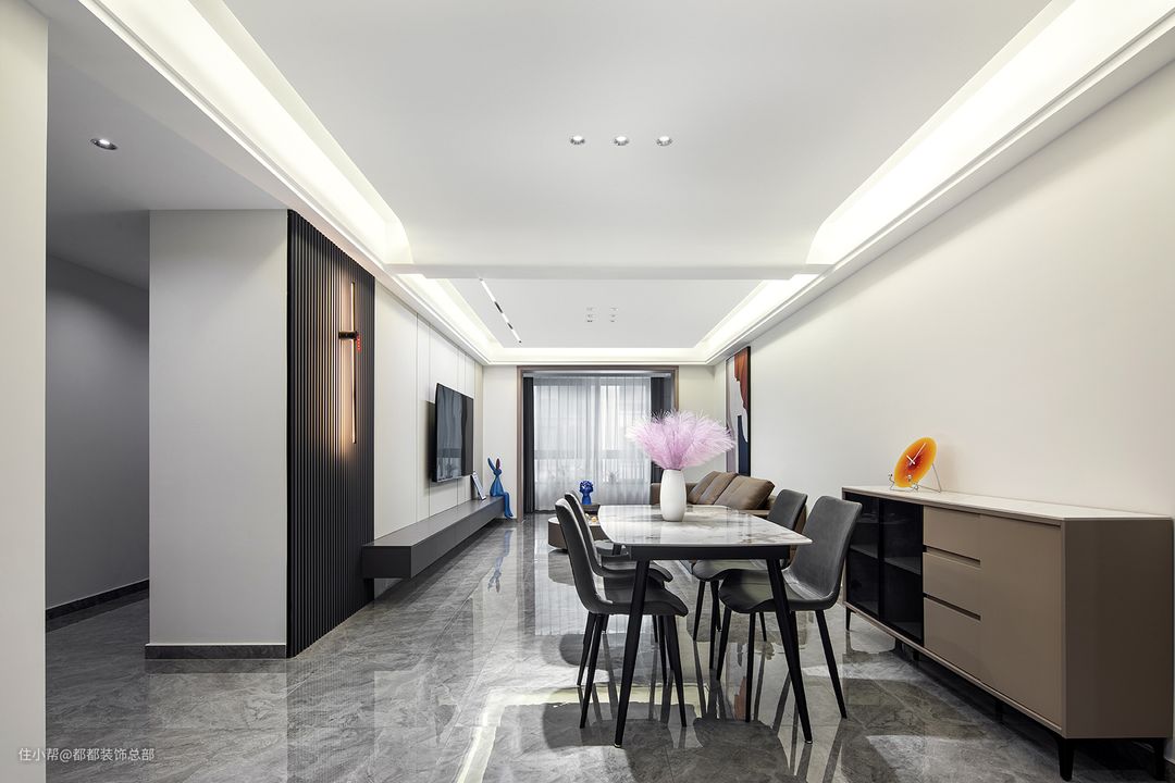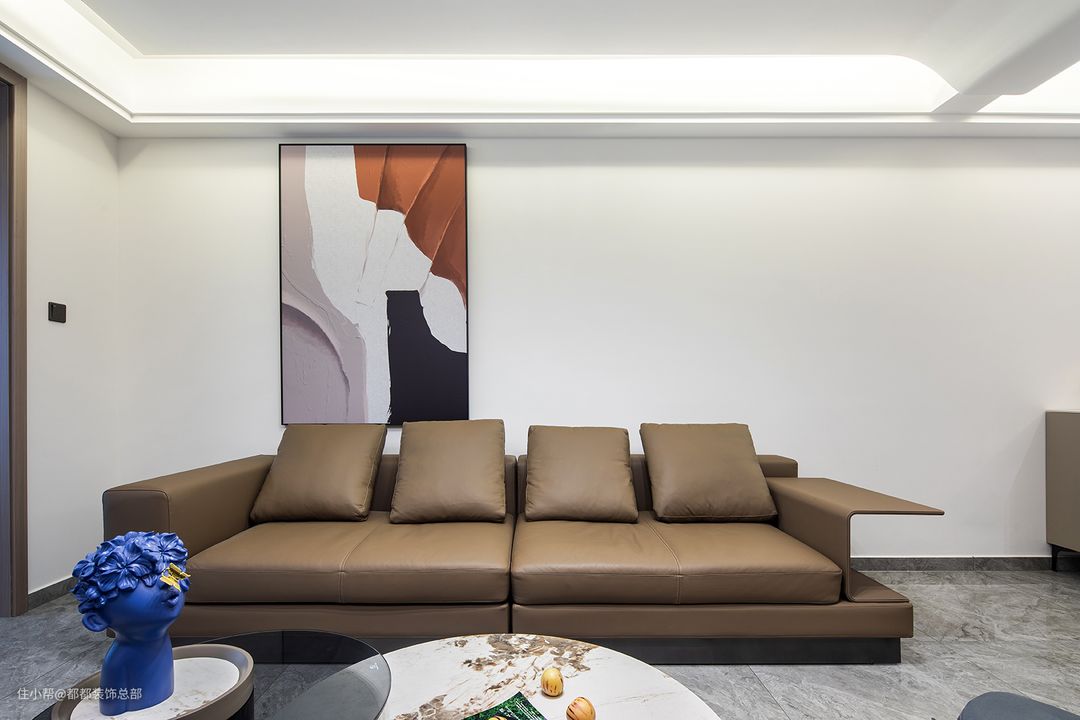 客厅的背景墙以木饰面作为空间衔接,顶面延续简约调性,凸显视觉层高的开阔,筒灯、吸轨组成极简无主灯照明,为空间运作出多层次的光影氛围,黄色灯光既营造出温暖的归属感,又缓和了大理石瓷砖的冰冷性。
