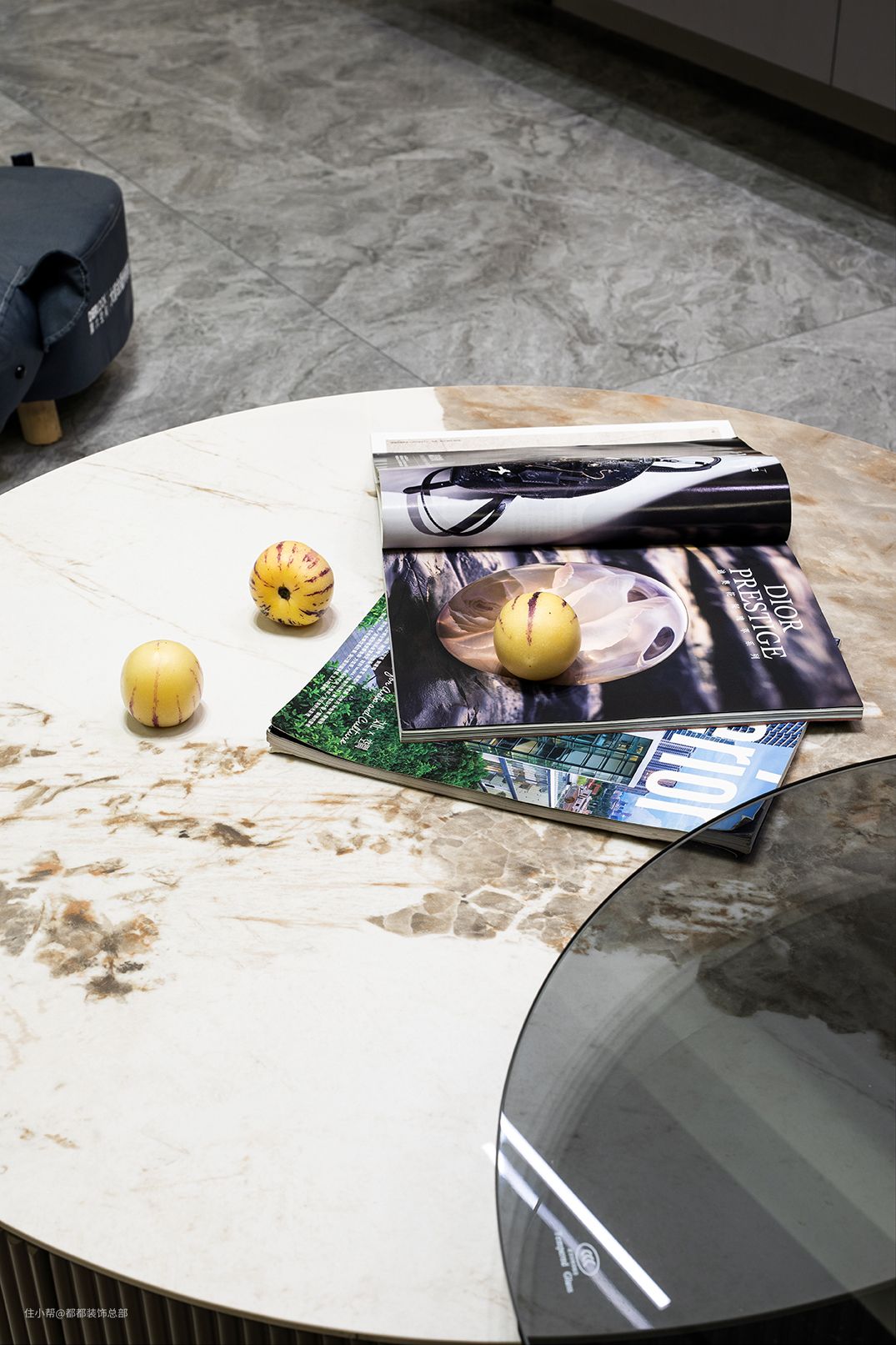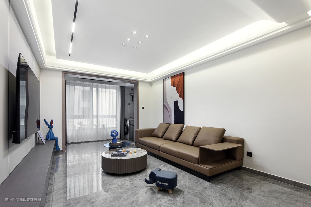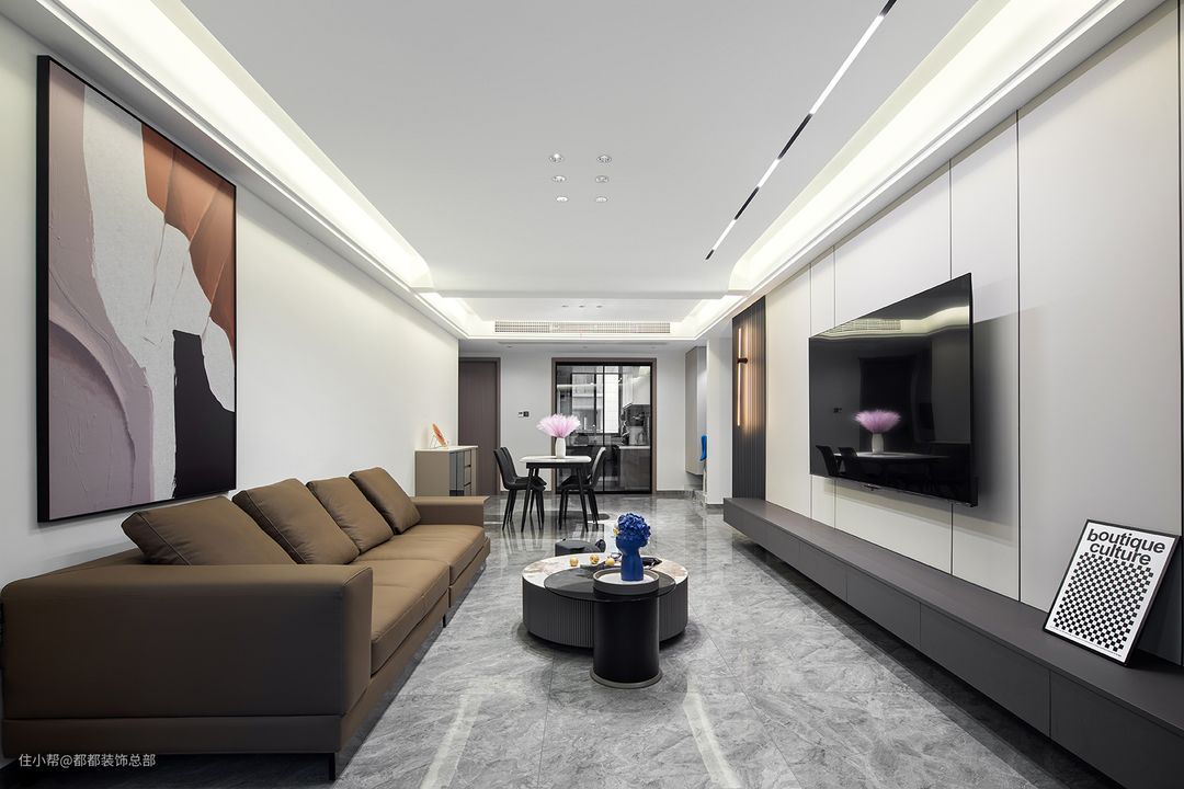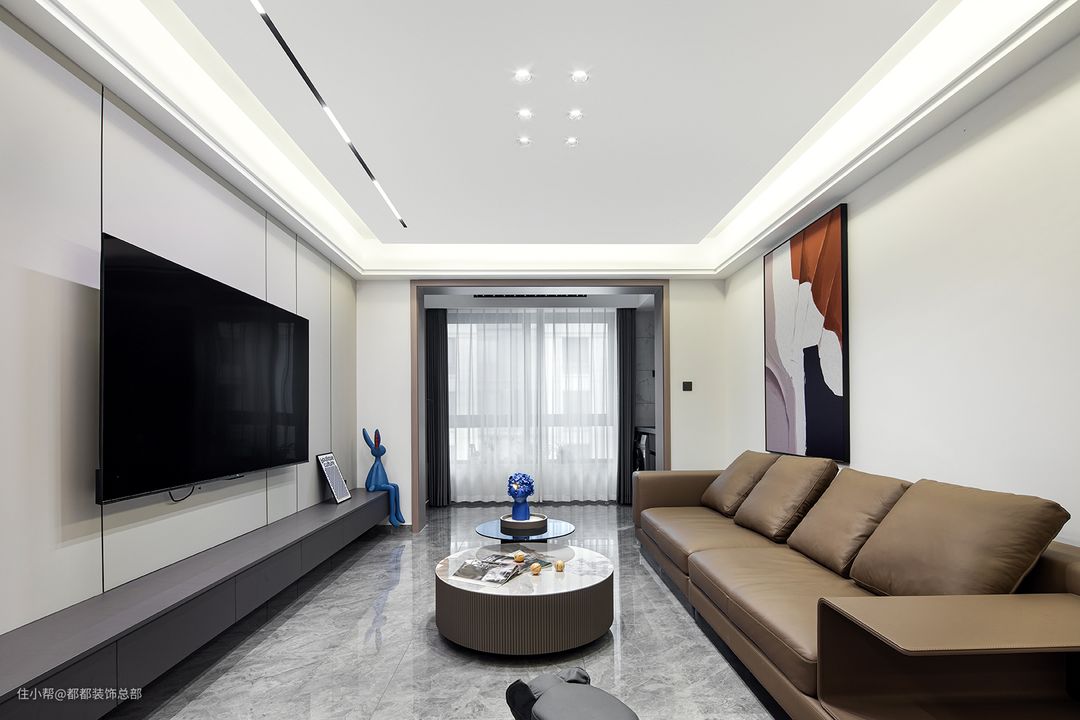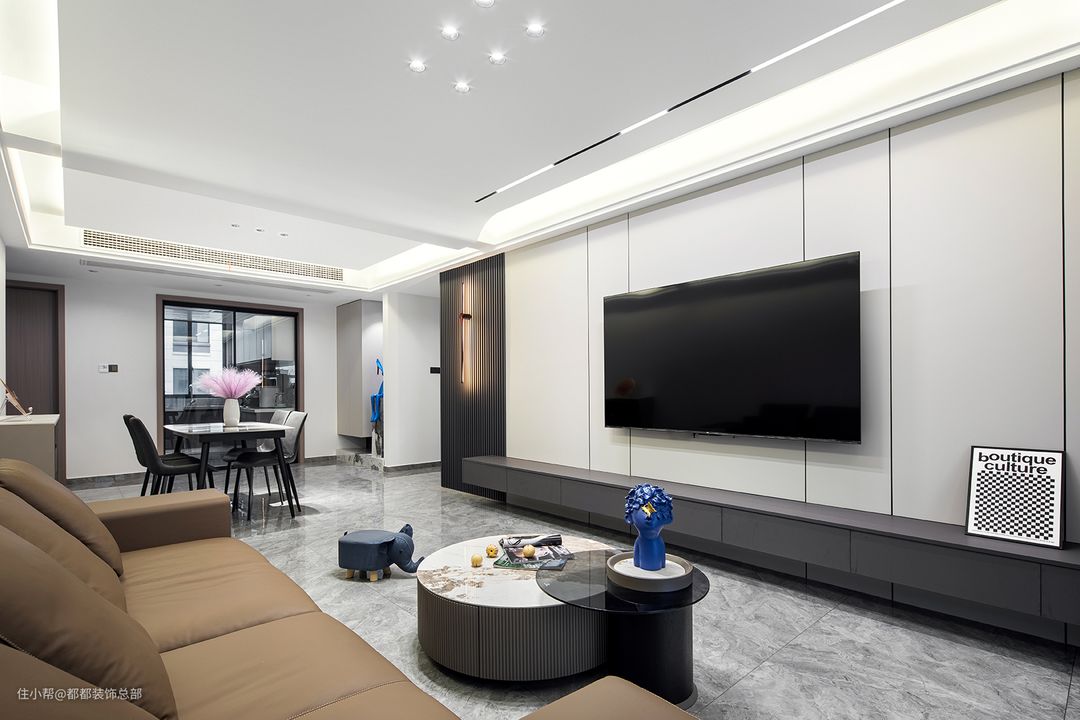 客厅的背景墙以木饰面作为空间衔接,顶面延续简约调性,凸显视觉层高的开阔,筒灯、吸轨组成极简无主灯照明,为空间运作出多层次的光影氛围,黄色灯光既营造出温暖的归属感,又缓和了大理石瓷砖的冰冷性。