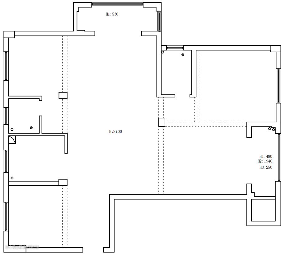 户型分析 1.原户型客厅是朝向东面的,如按照原始结构来做方案,只有早上有采光,下午家里整体就比较暗; 2.次卧主卧朝南,自然光微弱; 3.业主期望衣帽间独立于主卧外。