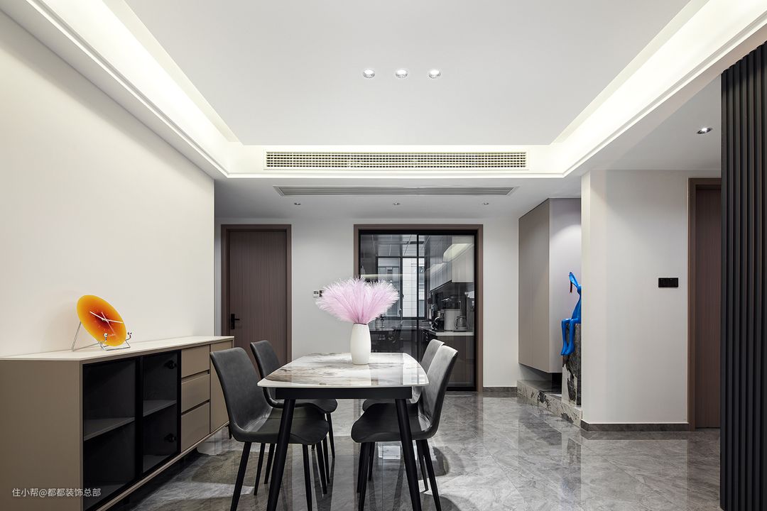 餐桌后面是低矮的餐边柜,黑色玻璃柜门和燕麦色搭配得相得益彰,在这样一个充满现代情怀与线条感的现代框架里,将木质的恬静温暖及玻璃质感进行融合,自然又宁静。