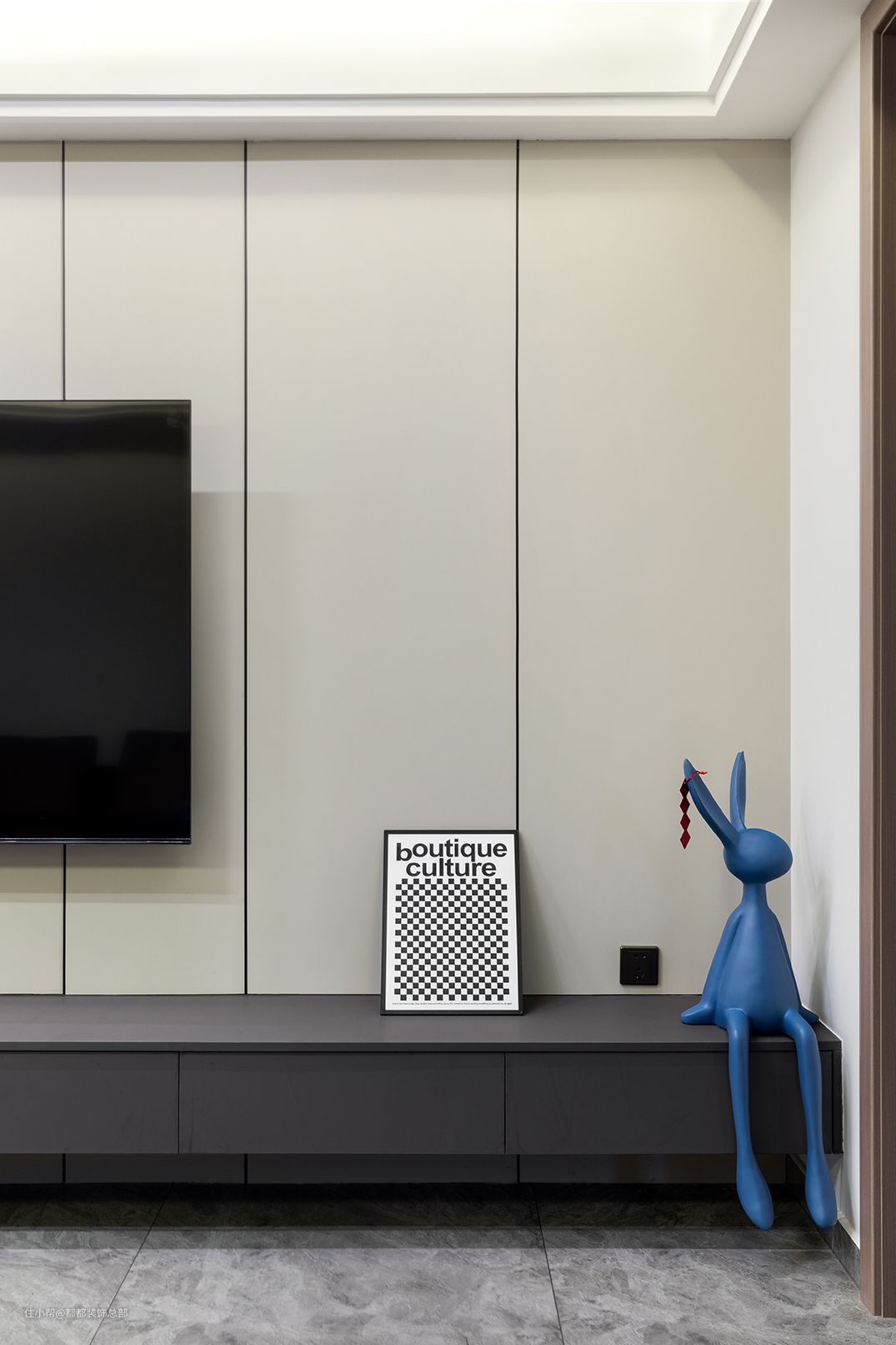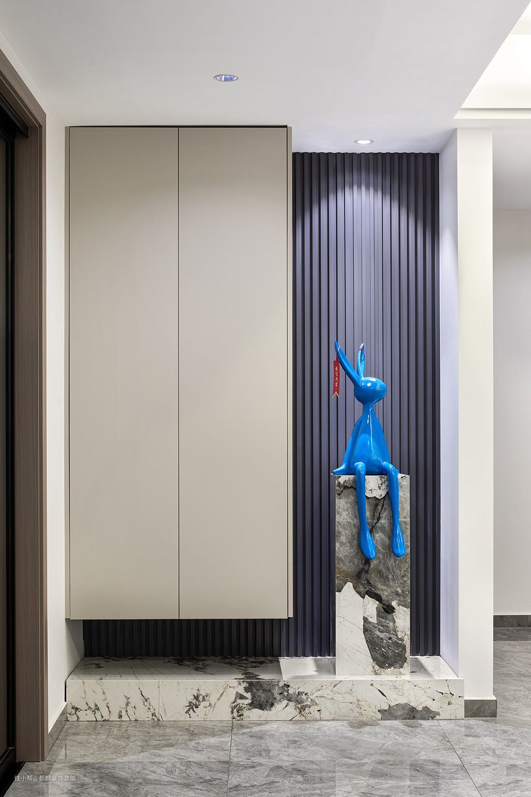 一入门左侧靠墙是悬吊式鞋柜设计,鞋柜底部悬空15cm的位置方便换居家拖鞋等,玄关柜底下突出了10公分的大理石地台,有助于防潮防霉,右侧延伸加高可以做展示台使用,蓝的小兔子摆件让空间不再单调,平时用来挂钥匙或者口罩也很合适。