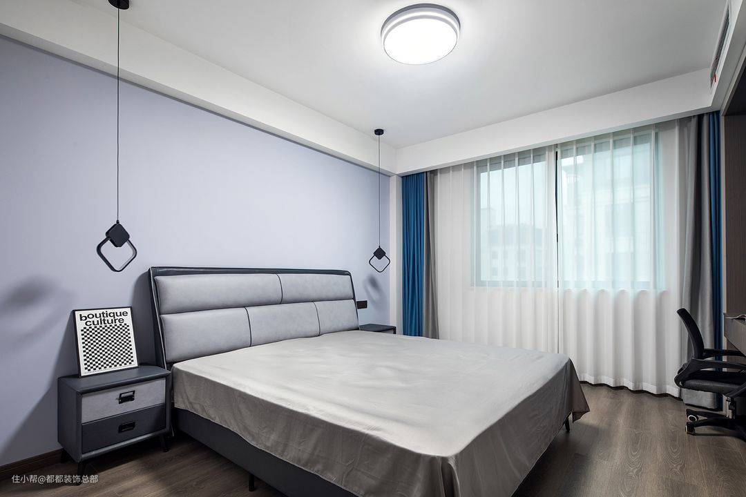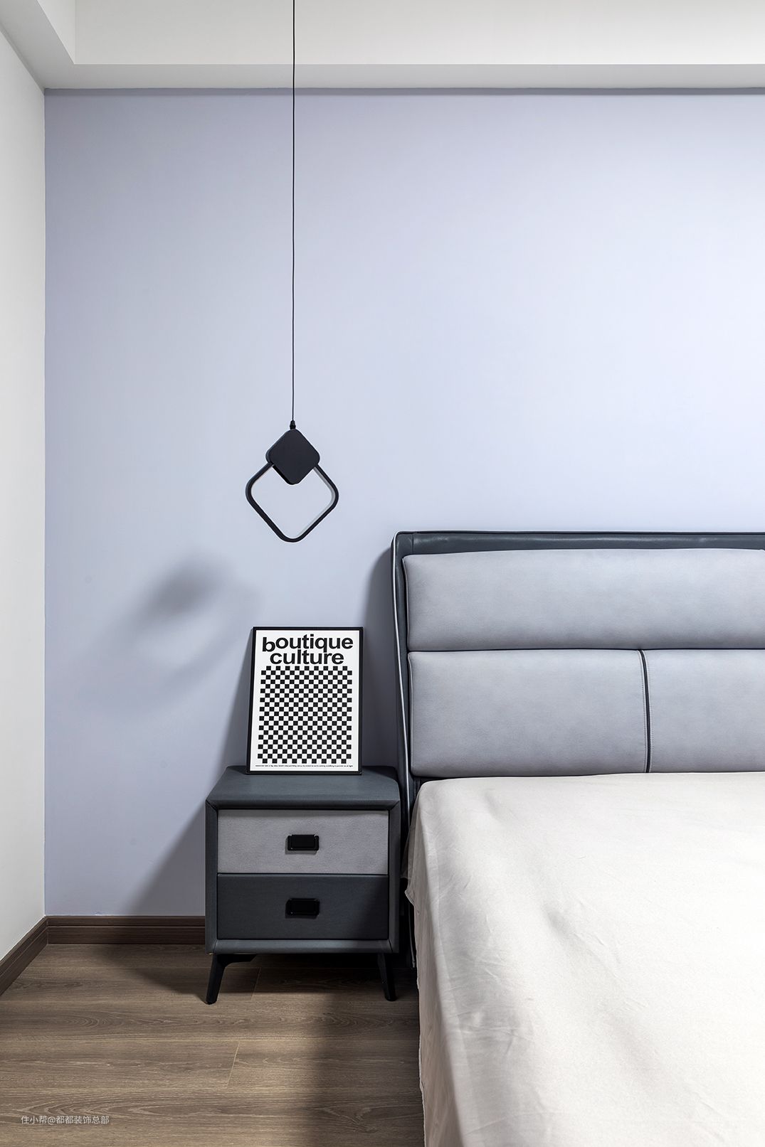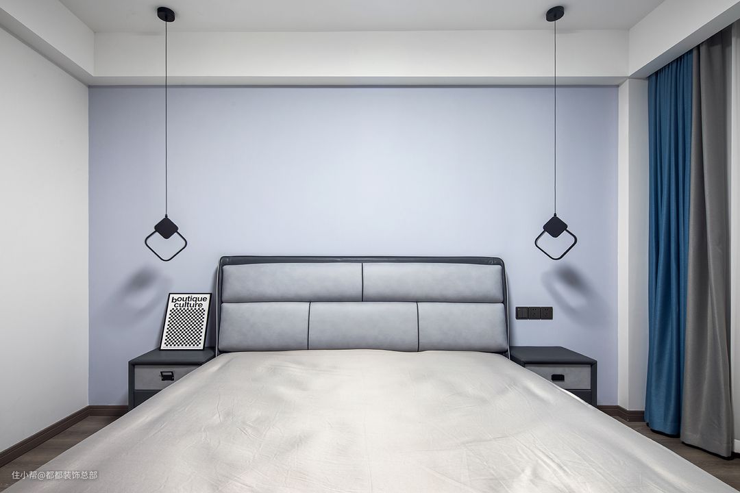 屋外的车水马龙车可得片刻逃离的自由,内心的噪音往往更令人心生浮躁,卧室的主色调是略显素净的浅蓝色,局部装点海蓝色碰撞为房间增睛,搭配线性几何吊灯与装饰画,将人拉回繁华都市的现实之景。