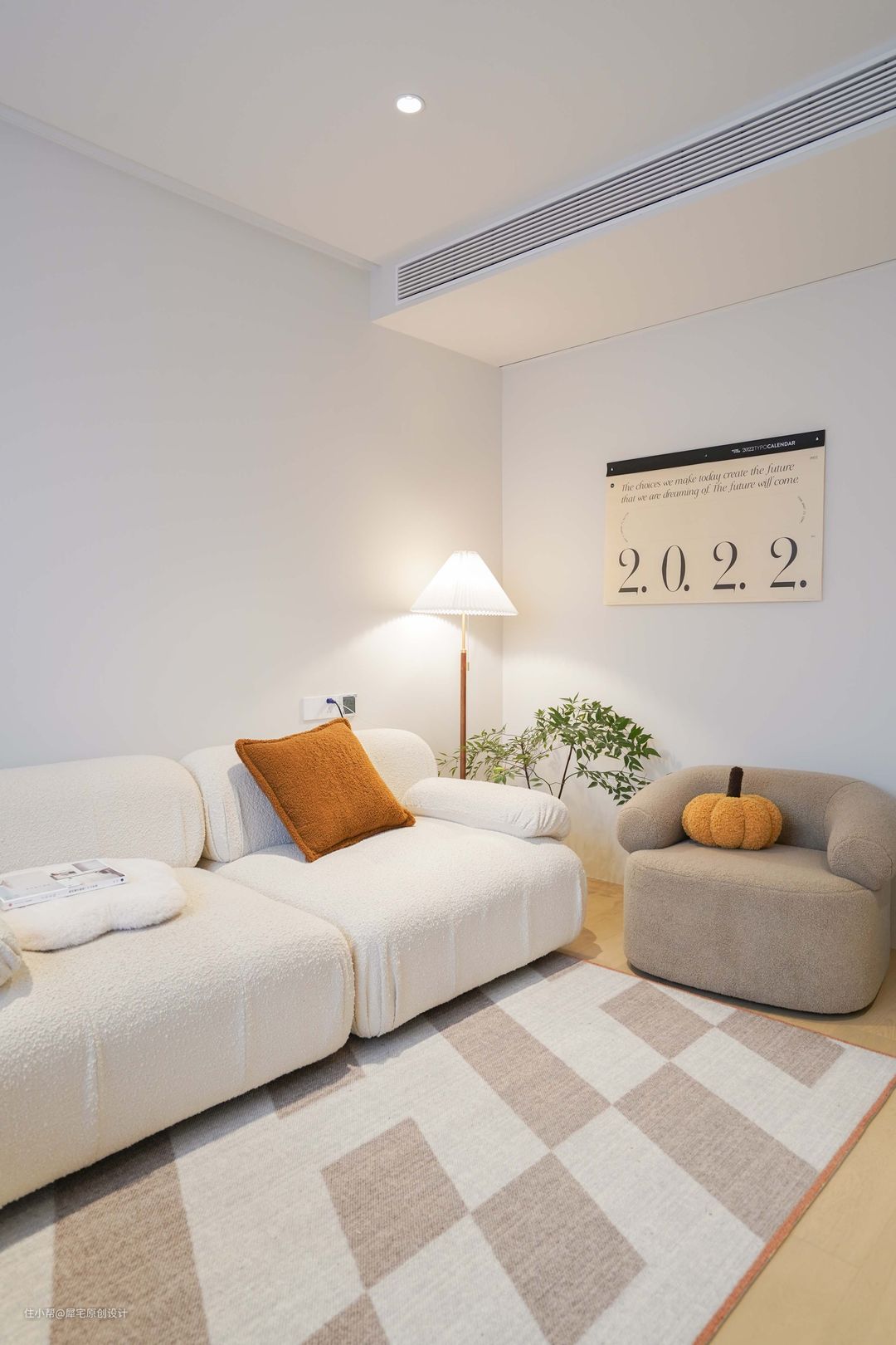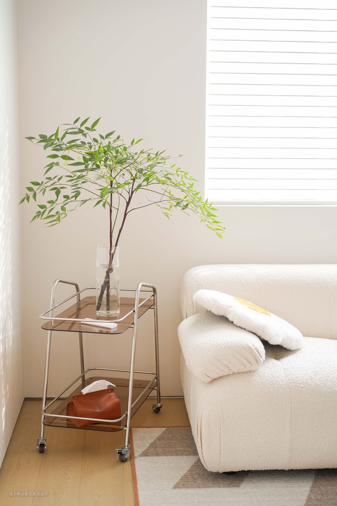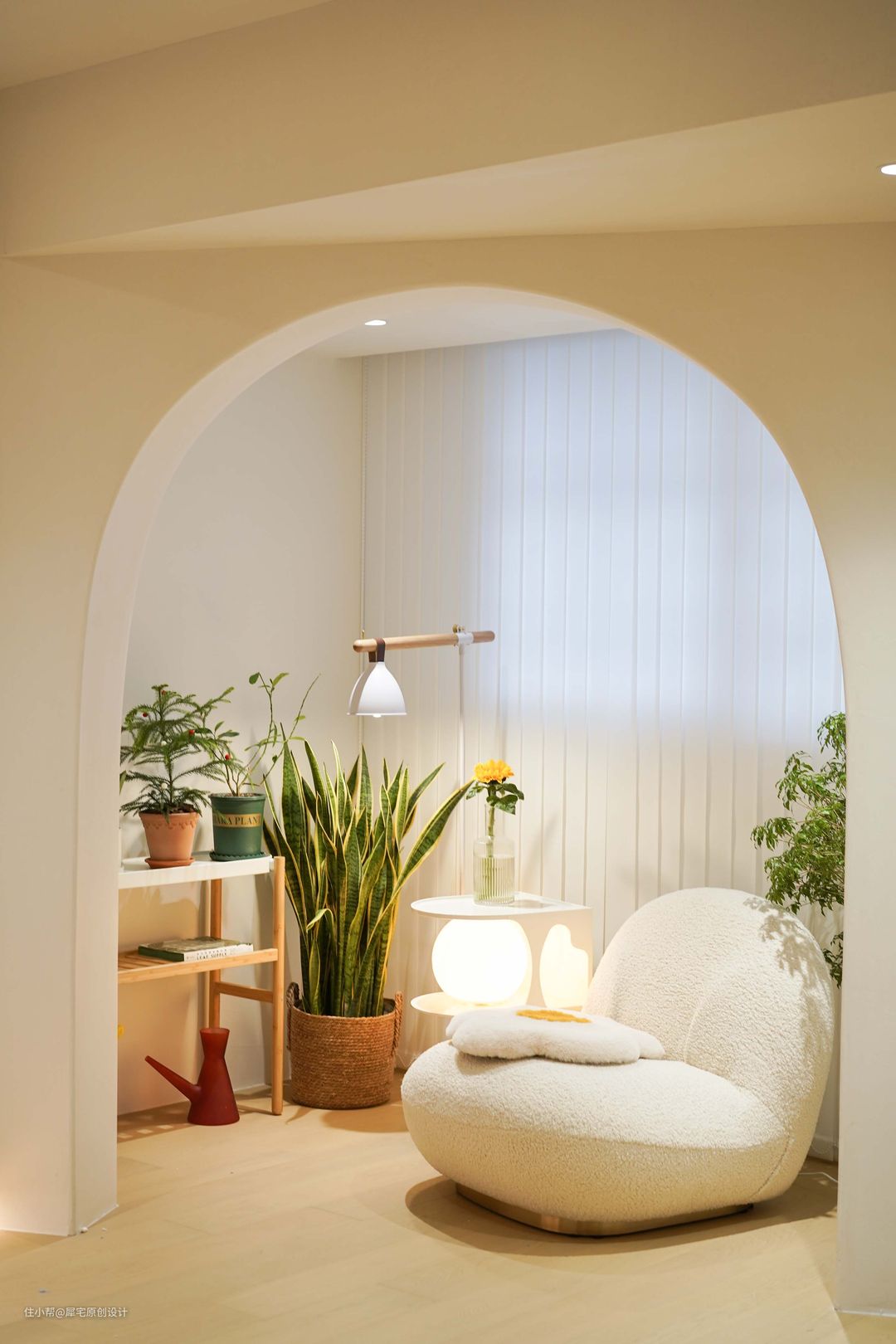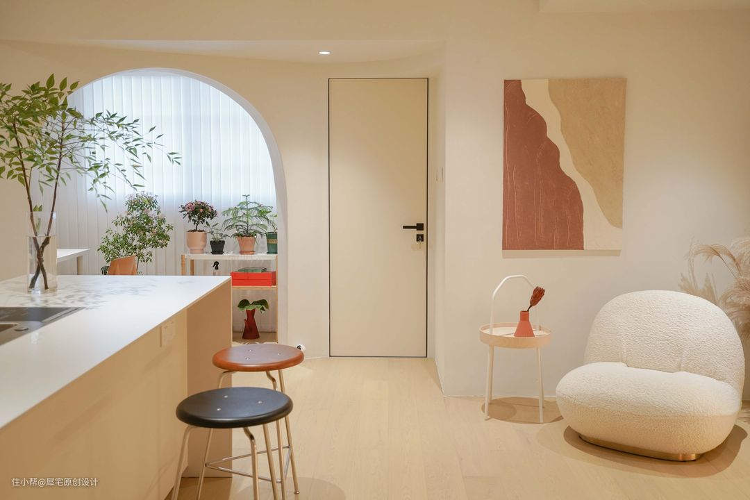 从玄关进入后,就可以看见奶油色调为主的客厅,氛围非常温馨,植物恰到好处地摆放在窗边,让家生机盎然。