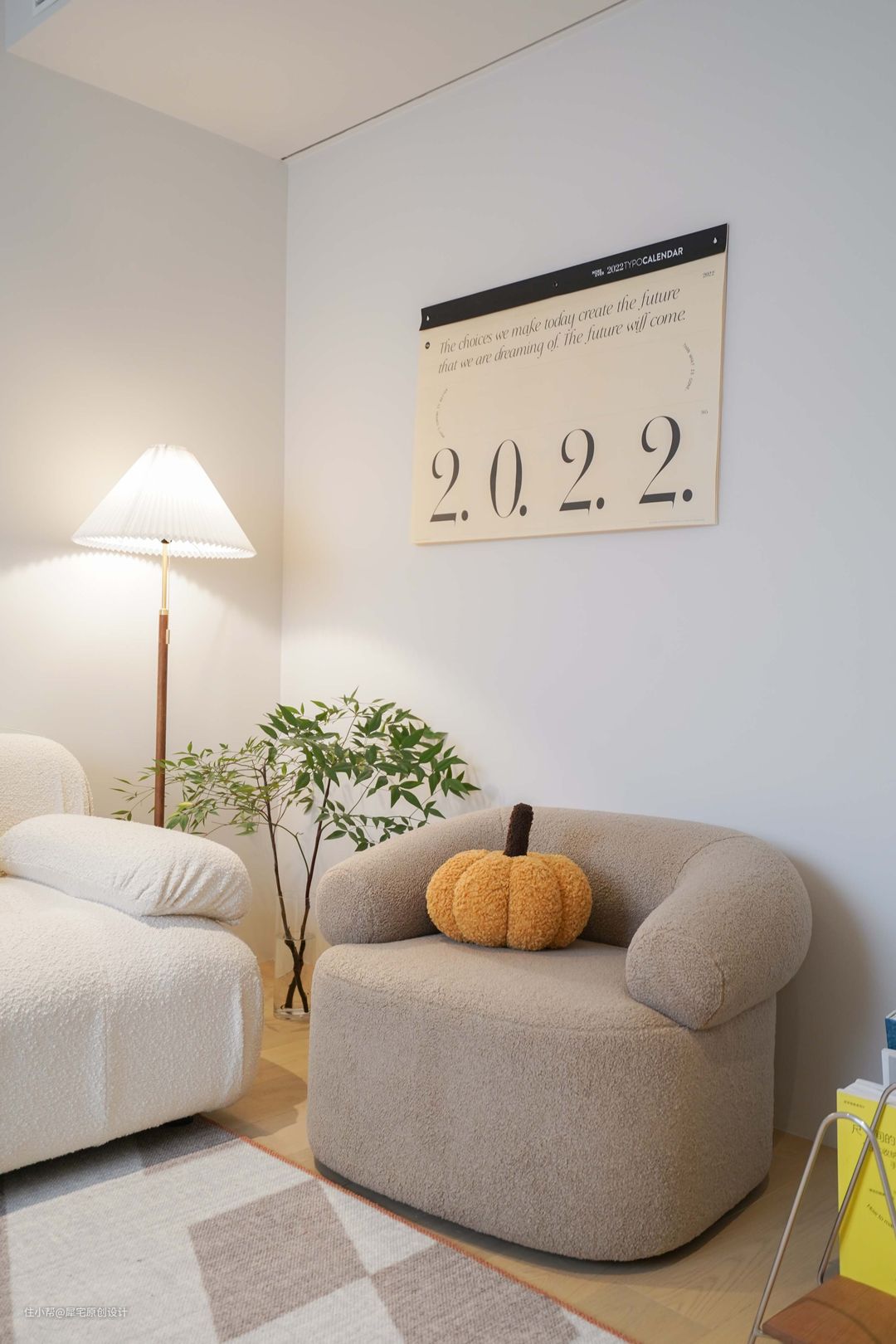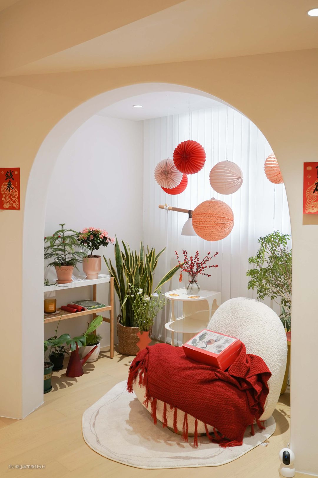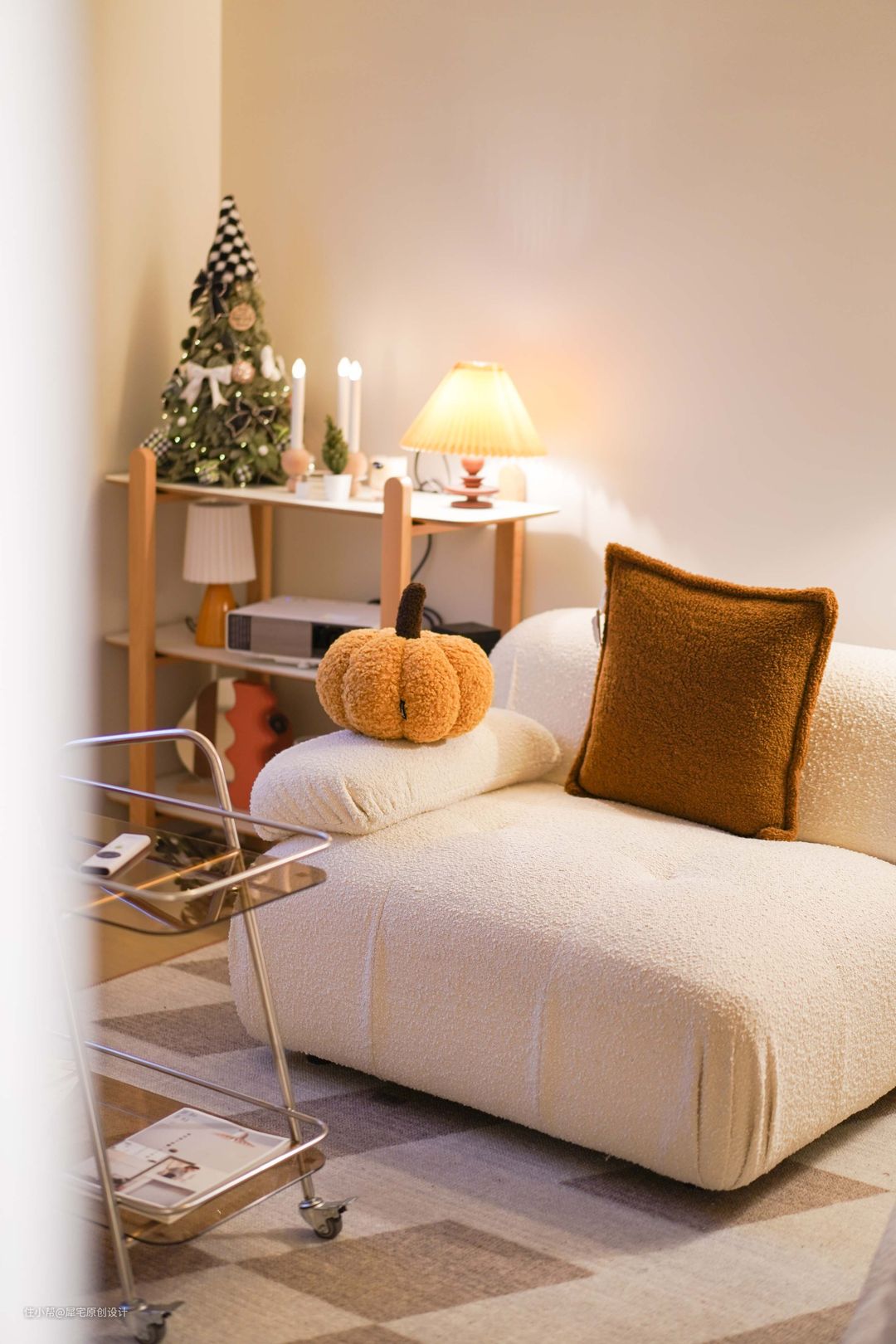 从玄关进入后,就可以看见奶油色调为主的客厅,氛围非常温馨,植物恰到好处地摆放在窗边,让家生机盎然。
