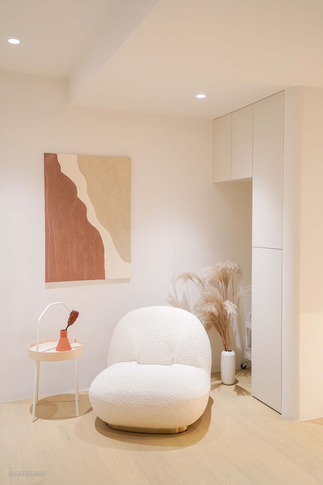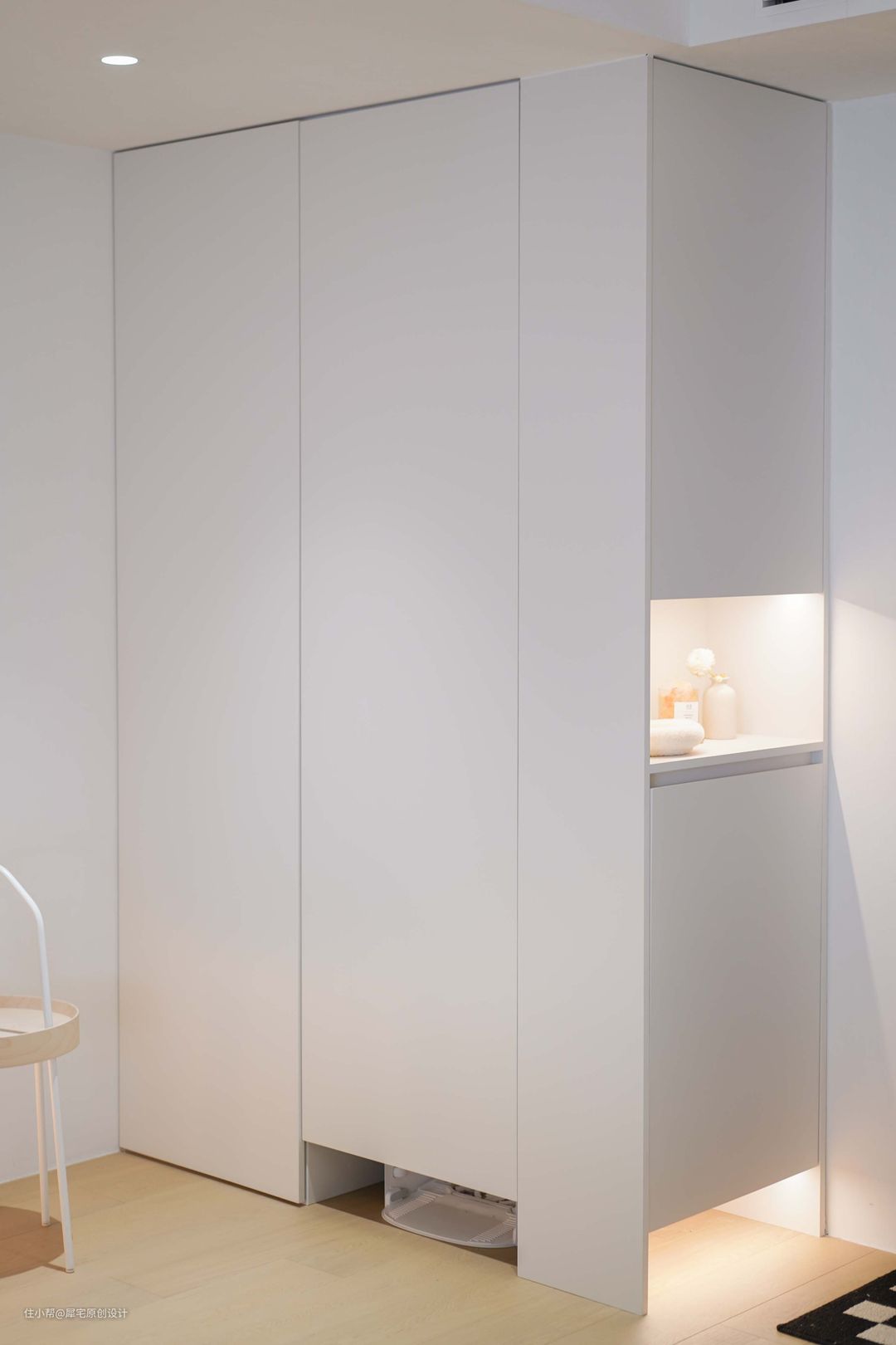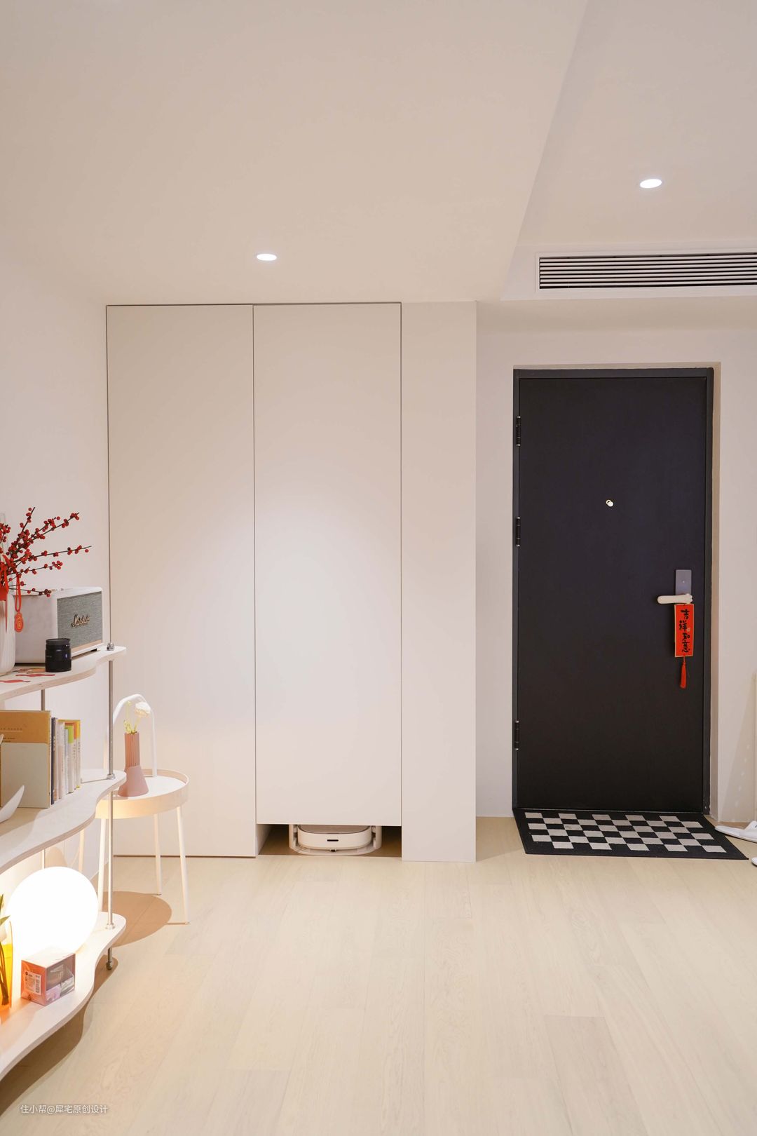 玄关采用顶天立地的橱柜设计,从外面看起来很简约,打开又有无限可能。虽然橱柜非常烧钱,但对于小户型来说,这是空间有效利用的不二之选,完全可以满足女主人的收纳需求。