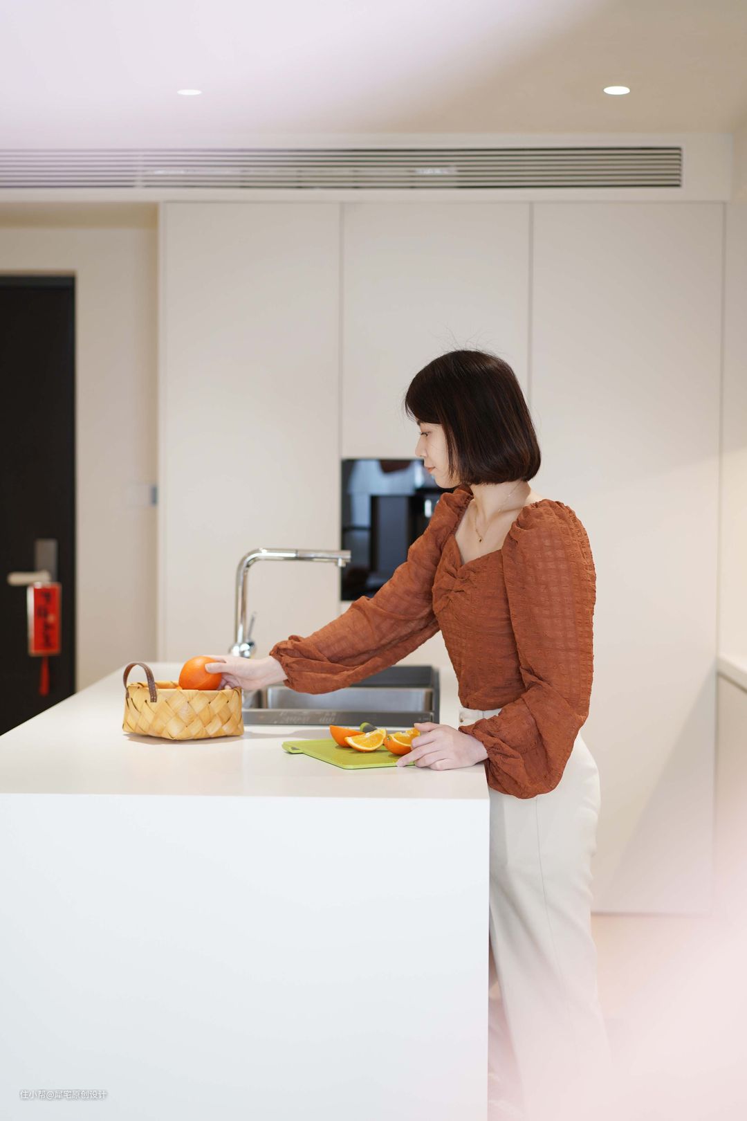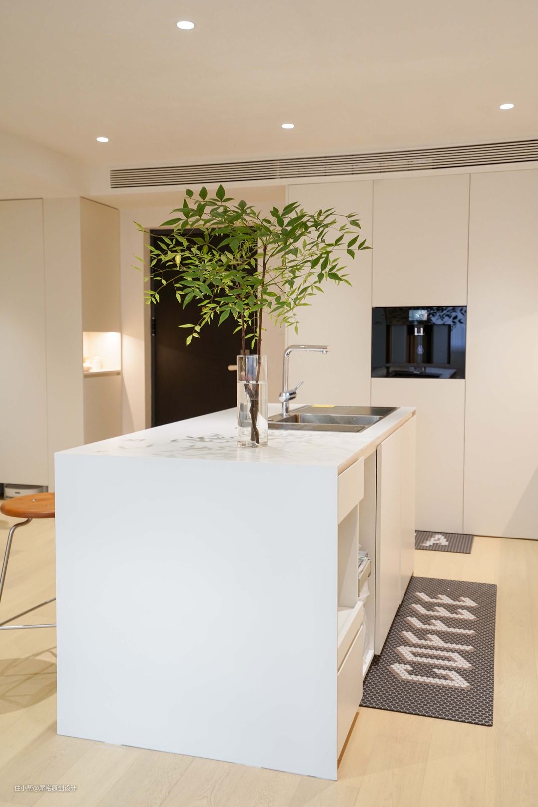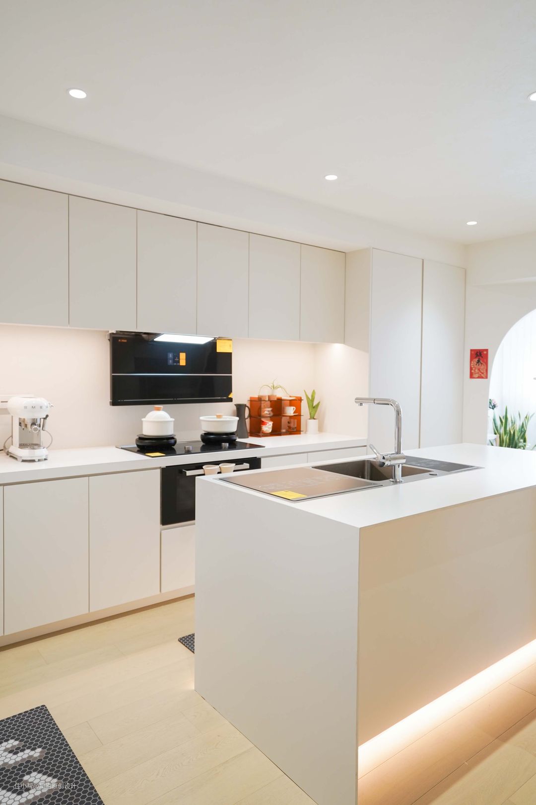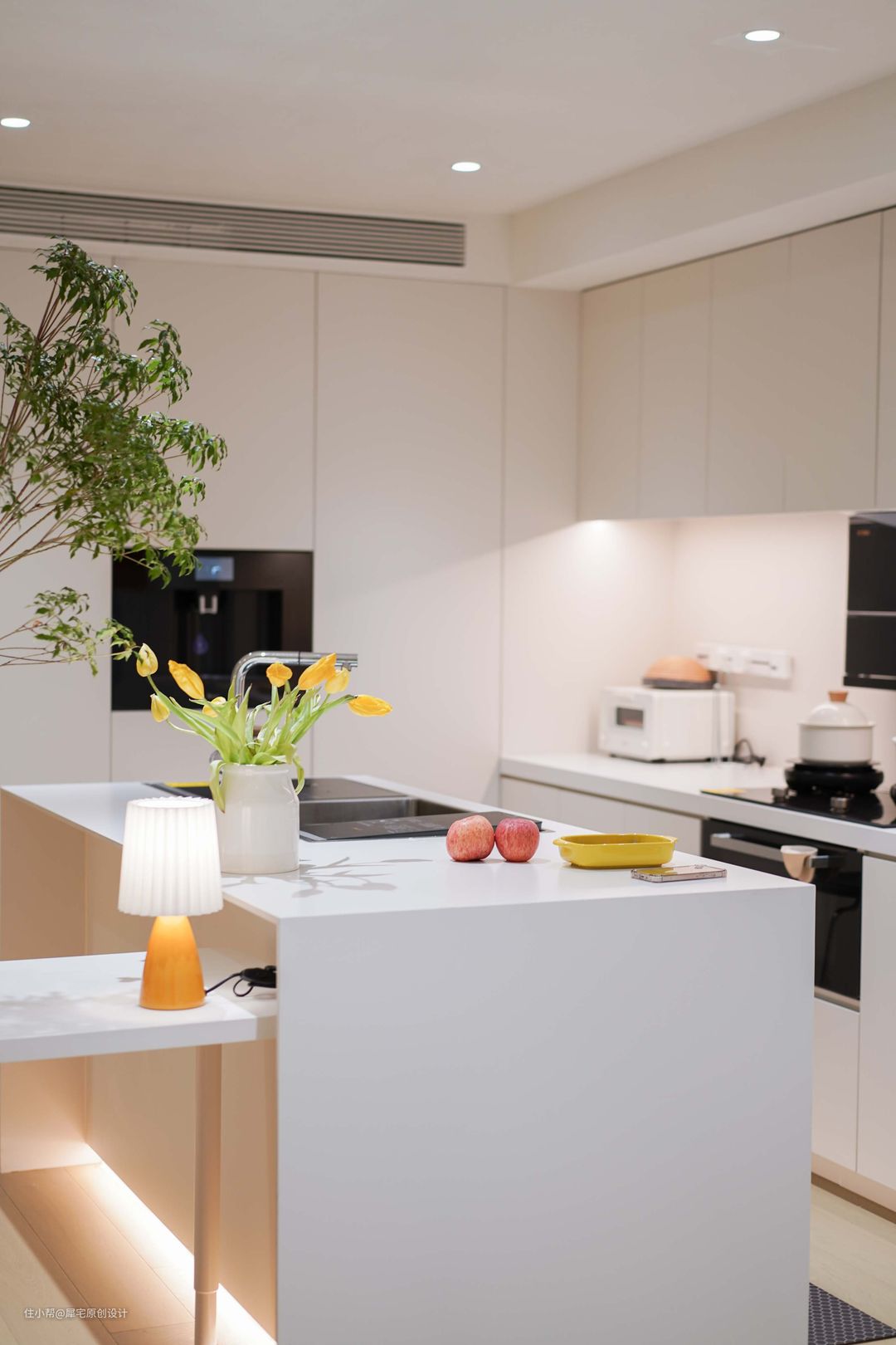 客厅的另一边就是厨房,整体采用LDK(客餐厨一体化)设计,配置到顶的收纳柜,空间宽敞,动线灵动,同时满足了女主人的大岛台梦。配色使用全白,看起来干净整洁。 因为是敞开式厨房,在选择厨房电器时尤为需要注意,不仅要考虑品牌知名度和售后问题,美观程度、烹饪功能、油烟问题、清洁问题也都非常重要。 在综合对比之后,为业主推荐了方太集成烹饪中心X系列。这款产品是一款新型集成厨电,采用嵌入式安装,不切断台面,保证了厨房设计的整体性,业主对这套厨电的颜值非常满意。