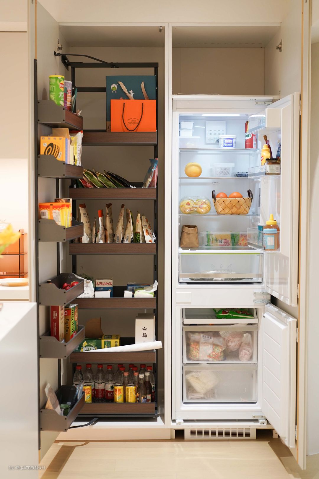 厨房储物层面,设计师采用储物与冰箱一体的隐藏式收纳设计,打开使用方便,关上也同样整洁干净。