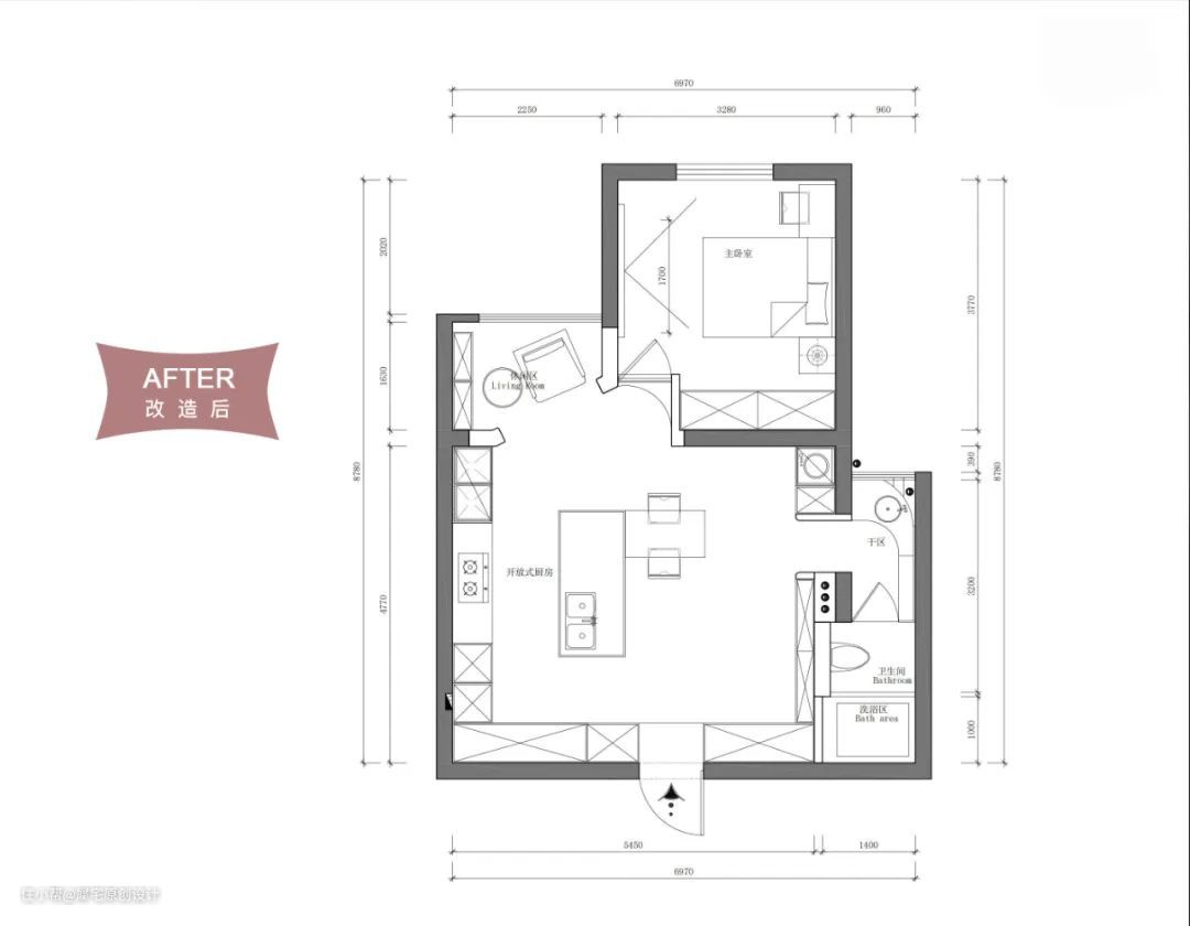 改造后设计成开放式厨房,压缩了传统客厅的概念。将非承重墙打掉,进门以后的空间变大。 本次遗憾的是女主人想要的浴缸受空间限制和整体效果考虑,进行了取舍。无论大房子小房子,每个人对家肯定都会很多设想。