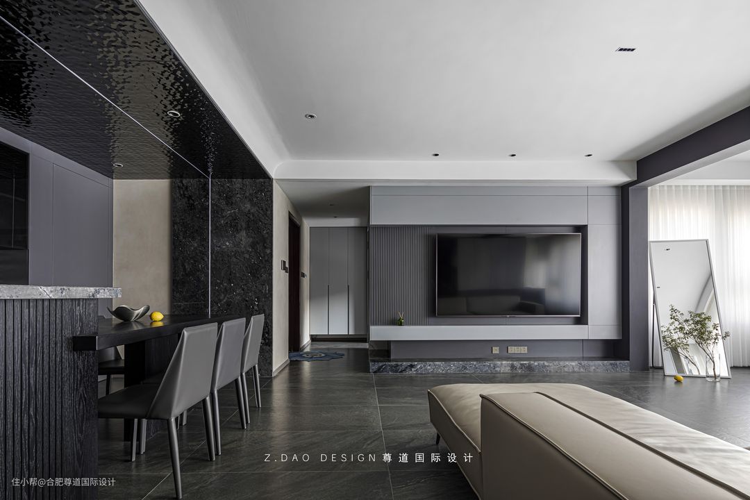 下部L形水磨石地台,连接了入户玄关与客厅背景墙面,形成由外到内的心里暗示,电视机造型柜下部的L形灯带,减轻造型体量感。 #玄关##黑白灰# #水磨石# #尊道国际设计#