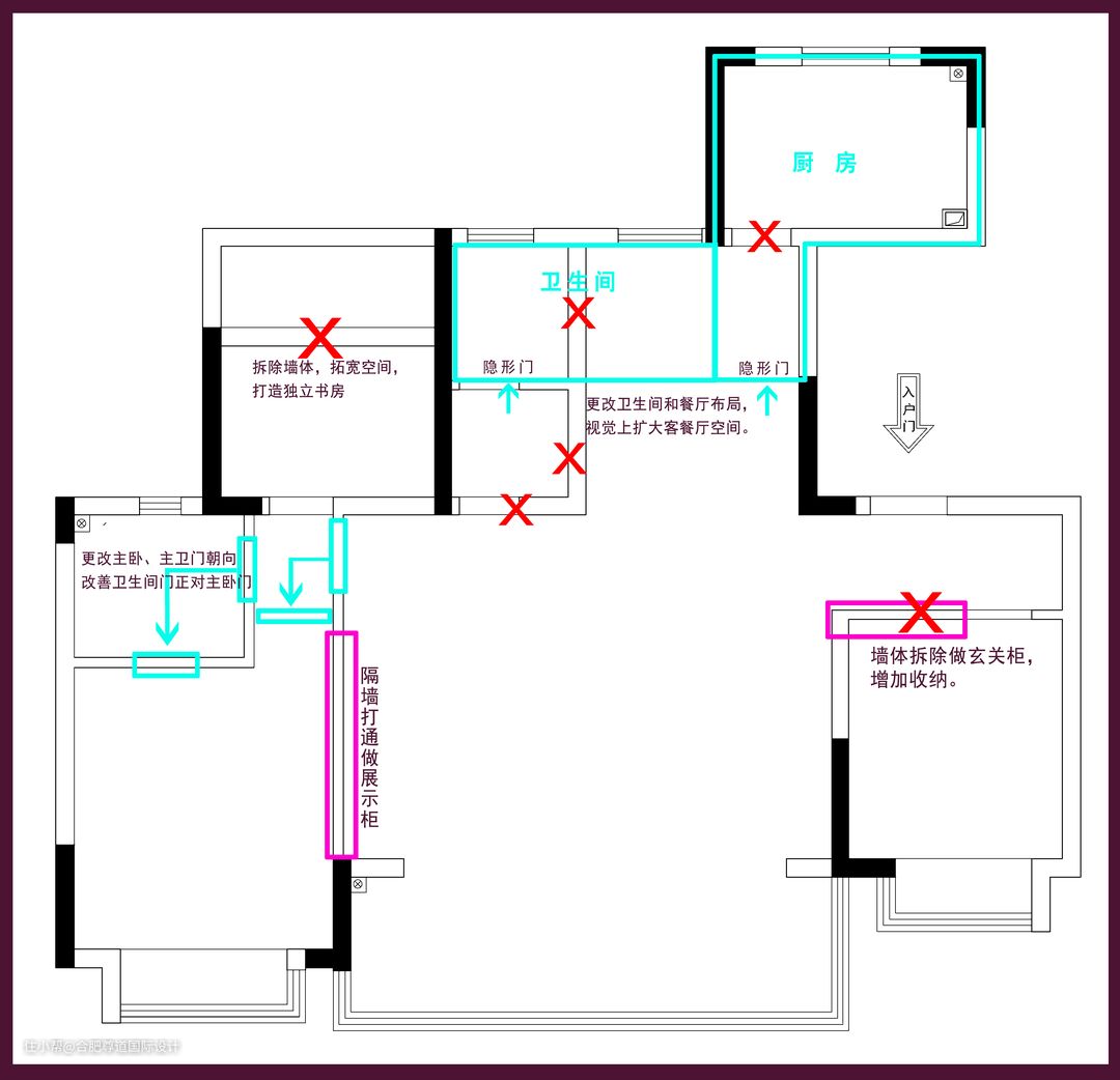 ▲原始户型图vs平面布局图 原始户型优缺点: 1、原始户型为三室两厅一厨两卫一阳台; 2、户型方正、南北通透、采光充足; 3、餐厅开间空间位置狭小; 4、主卧门正对客厅和主卫生间; 5、书房未外扩前空间较小且缺乏采光。 根据房屋特点和屋主需求, 我们做了如下改动: 1、拆除了入户正对着的墙体用定制玄关柜取而代之,不仅增加了玄关收纳,更添趣味性和美感,避免了入户直面白墙的无味感; 2、打通客厅与阳台和主卧的隔墙并设置一整面展示柜,将客厅与阳台划为单个整体空间,加强了视觉拉伸感; 3、将客卫和餐厅原始东西布局,改为南北布局,强化餐厅与客厅之间的联系,打造一个社交餐厅,使客餐空间达到最大化的视觉效果; 4、餐厅布局采用中岛的形式,岛台与餐桌在形体上呈现穿插设计,形成洄游动线; 5、更改了主卧门和卫生间门的朝向,将原始北侧的书房空间从套房设计中分离出去,满足客户独立书房的需求也改善了主卧门正对卫生间门的情况。