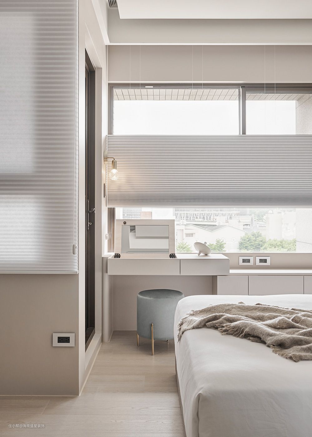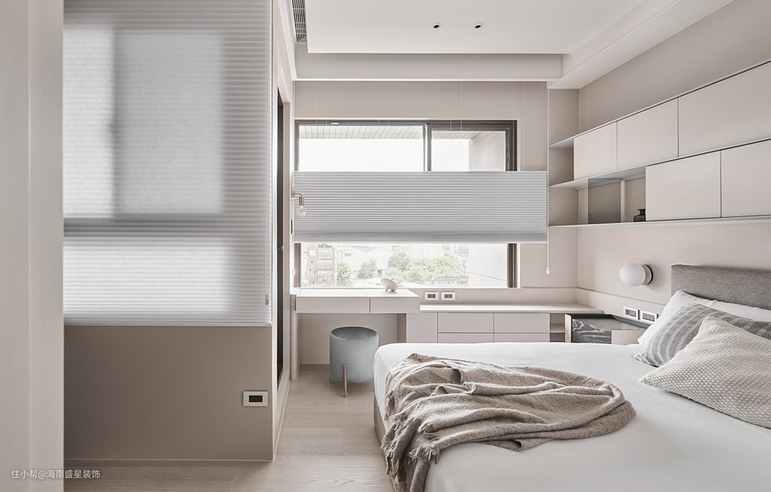 窗下一排收纳体续以纯净定位,将杂乱日常备品收于无形,也一并采用上掀式化妆台收整镜子与保养瓶罐,以保采光窗的完整性。