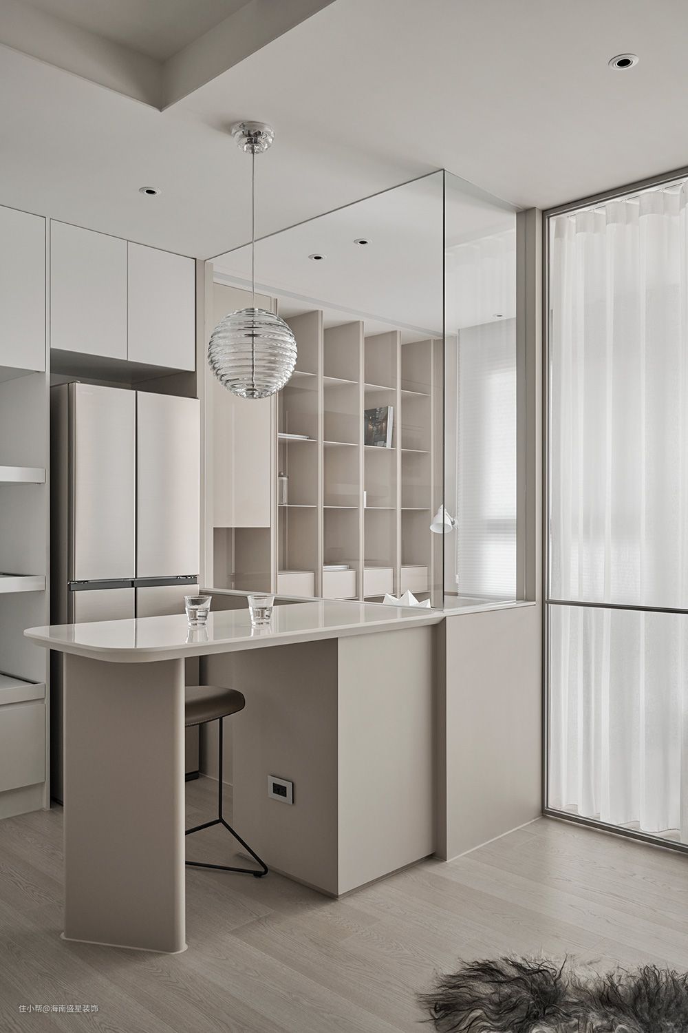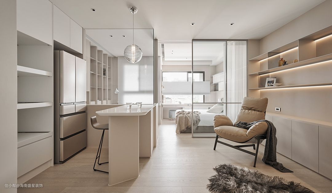 光衬托出影、反射出色彩,就像一切存在的开端,为所有故事拉开序幕,而盛星装饰所设计的50㎡小宅便以光作为引线,勾勒出生活。 屋主总向往着在窗前练琴,最好能拥有独立式书房、更衣间,过上自适自得的日常是拼搏的期许,于是循着光开始,抛却那些漂泊寥落、在外租屋的日子。 设计师循光敞开既定框界,为场域投入一窗明媚光景,从此卸下坪数印象,还以杳无轻重的奶茶色调,藏收城市里的喜怒哀乐,轻柔推进时光;用一片澄明透澈归宿,觅得安然静心的自己。