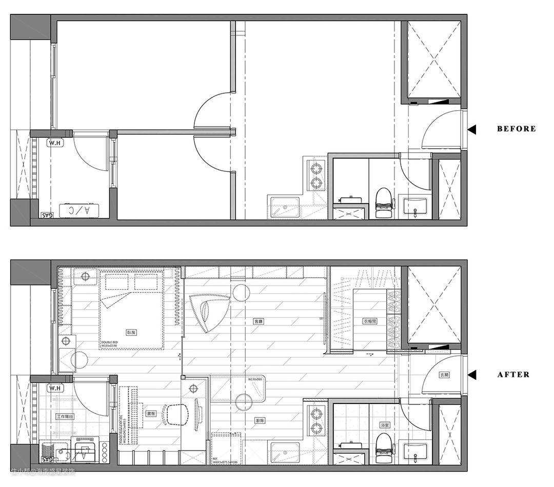 及腰壁板圈绕着卧房,拉开一道平衡之轴,此举即取自窗下高度,沿着化妆桌面延展而开,定调了领域内的纵横秩序