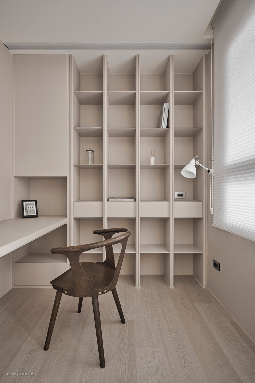 沿墙推出的收纳下柜,以一身奶茶色系消融了体积感,在光影作用下,层叠出深浅次序。开放式层柜则邻靠电视墙之转角,借着事先预留好的线槽,成为所有机器设备的归宿,更设计了圆柱形转角,以光影具体其存在。