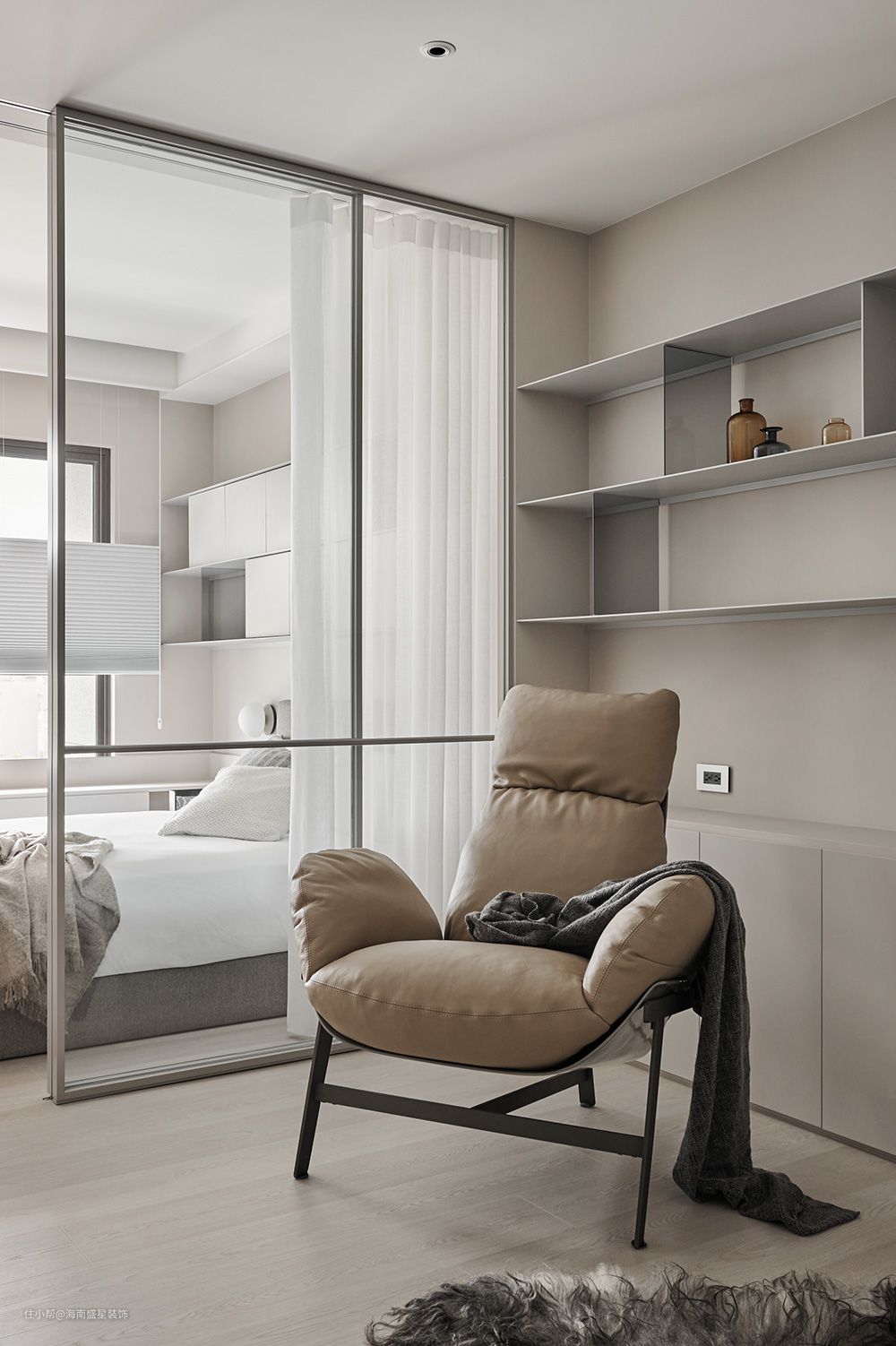 尽管如此,床头上壁架却别于客厅层架之外型,交错在灰玻隔板之间,错落置入封闭式量体,丰富墙景层次;层板之下,同步嵌入一条灯带,渲染夜色下渐层光氛。