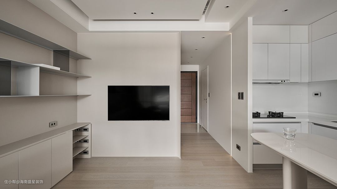 定睛一看,横放餐桌实则与书桌相并,以L型安排界开餐厨与书房之时,实现了随时随地看电视的享受;推敲着空间最大值之余,设计师更巧用其使用高度落差,砌起半高矮墙、藏入镶嵌插座。