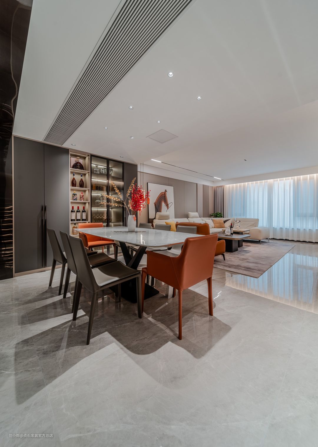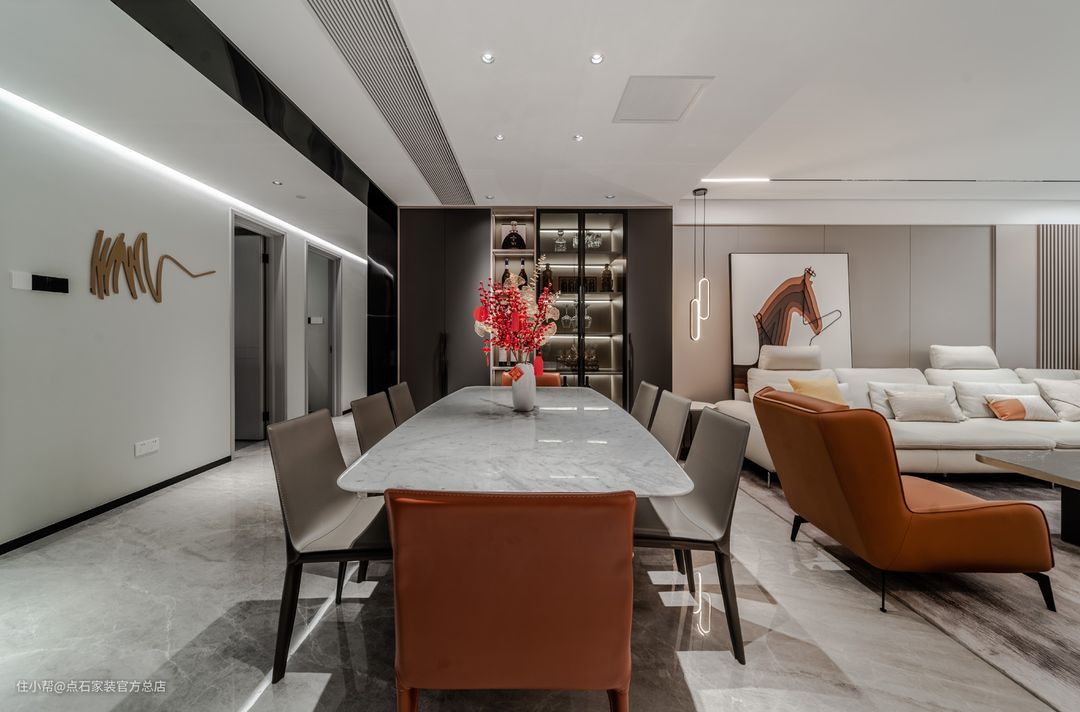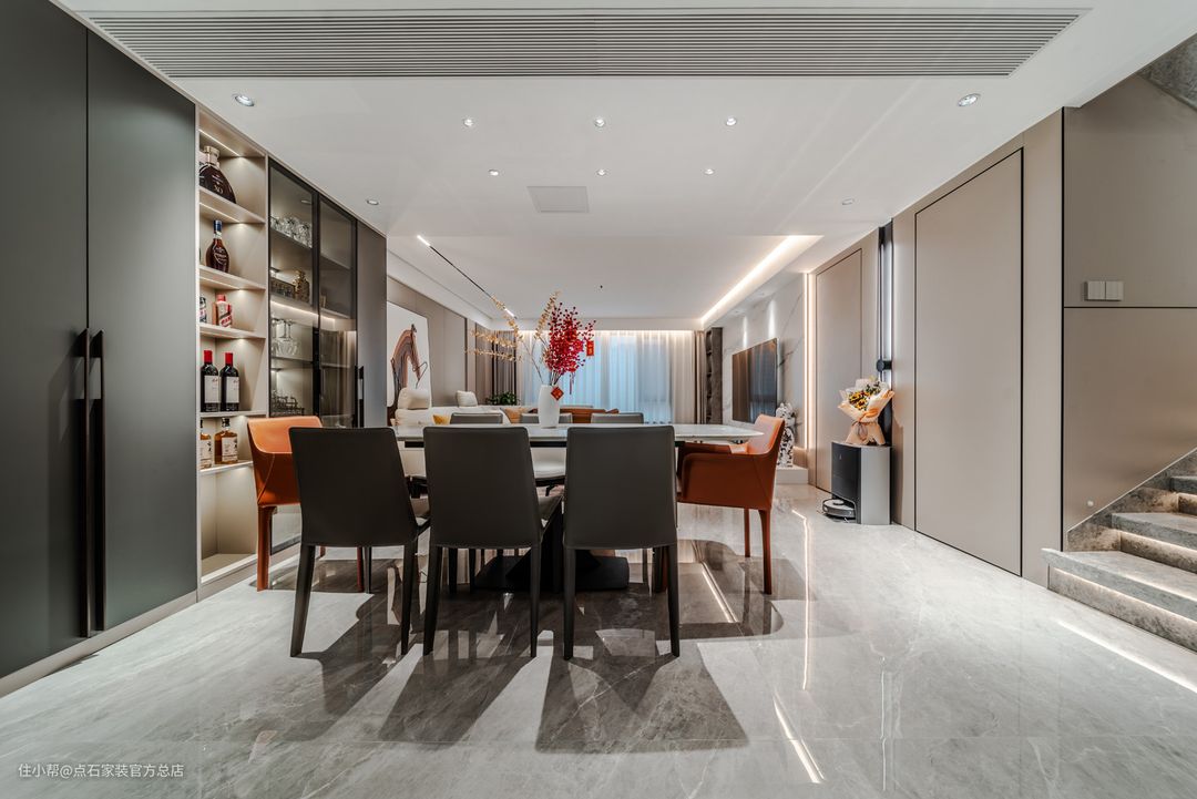 餐厅区域,在灯光视觉上,提前做好了无主灯的规划,并且用筒灯充分的照亮了整个餐厅的空间。另外在收纳上,也用客厅多余的空间做了餐边柜和酒柜的设计来补充客餐厅的空间。