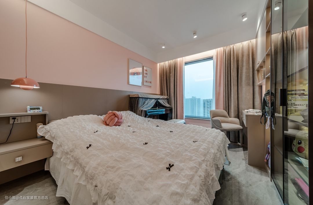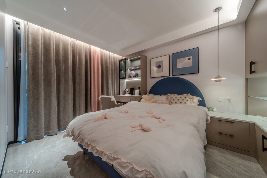 儿童房区域,对颜色和空间的利用掌控的刚刚好!用粉色和白色等相近色系的颜色进行搭配,让整个空间融为一体更加舒适。另外也利用了床头的空间做了定制墙头柜,充分的利用了空间。