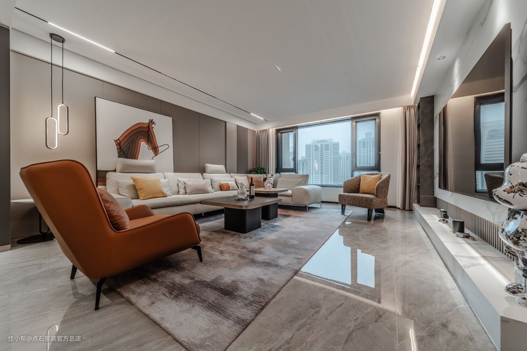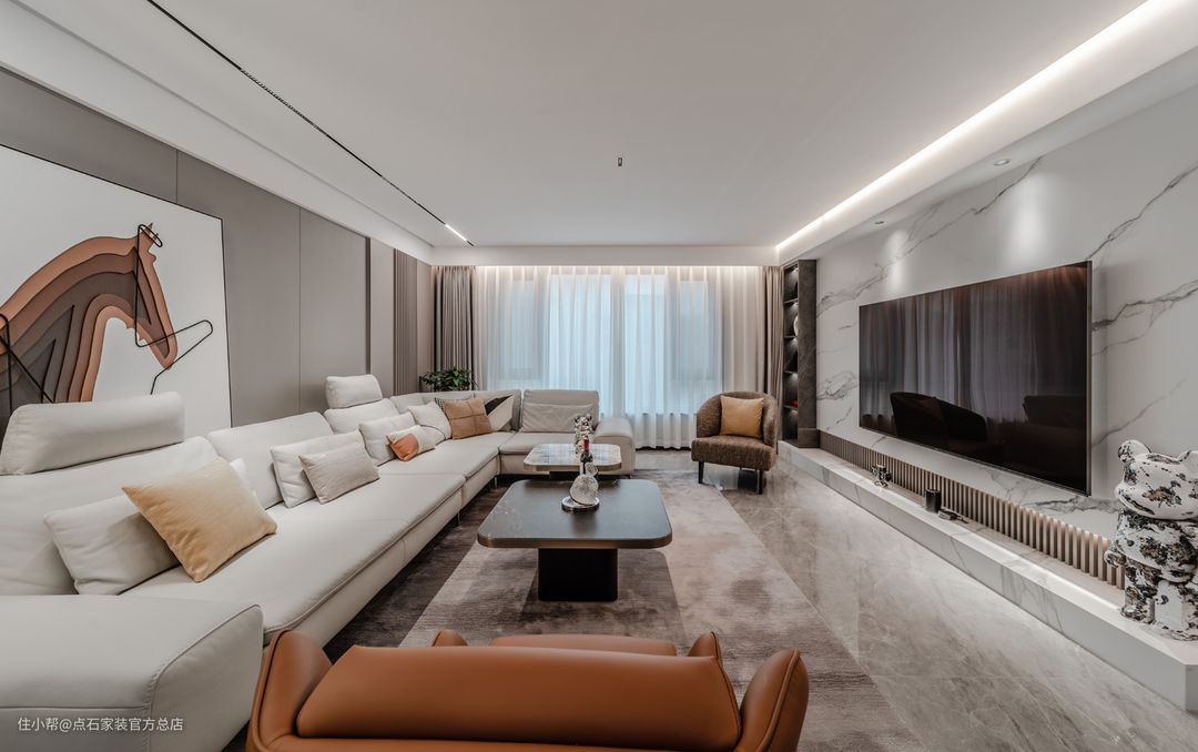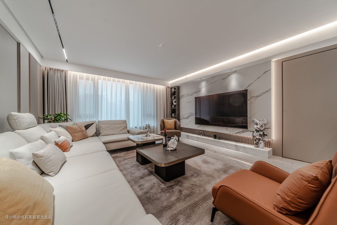 电视机背景墙区域,选了长条的岩板加木格栅的设计,在视觉上起到了空间延升和太高的作用,并且材质本身也给客厅增加了许多的质感。