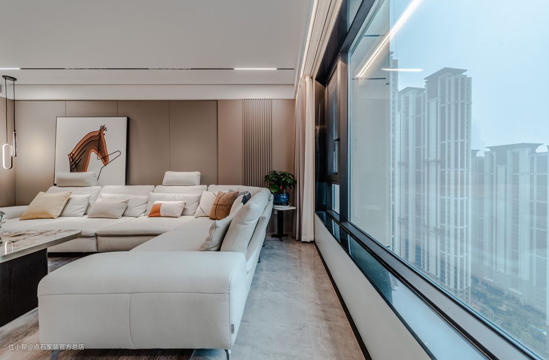 客厅区域,一眼看去给人很干净的感觉!在软装和材质上都选择了很温和的颜色和材质,让整个家里变得更加温和且舒适,没有压抑感。
