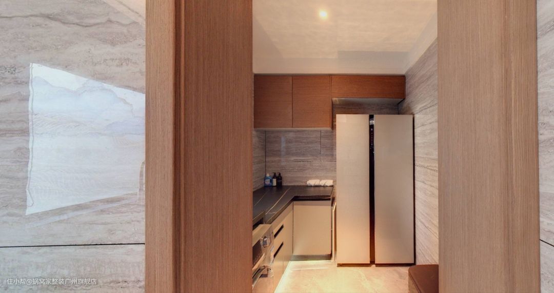 厨房做了一种方形凹凸吊顶,暗藏灯带,减少了以往铝扣板的淡雅,让整个空间更加轻盈,又增添设计感。