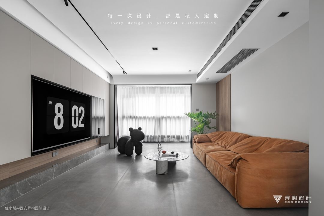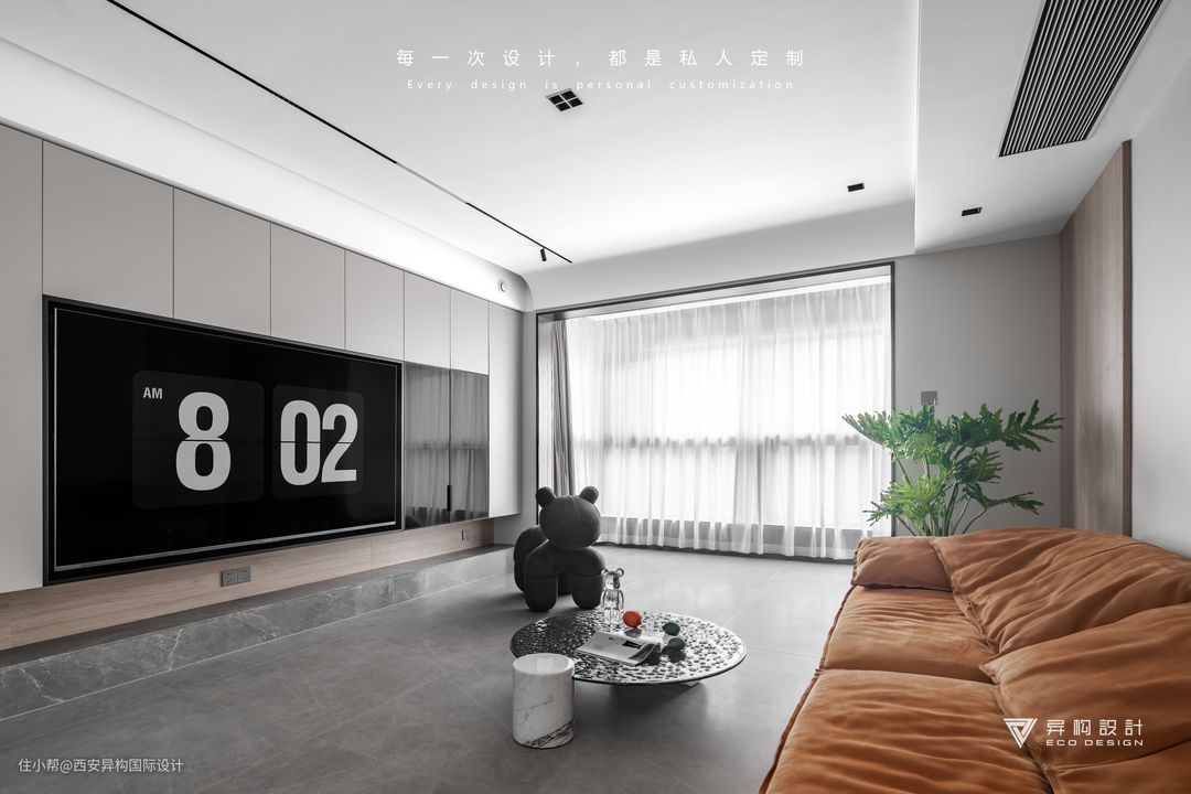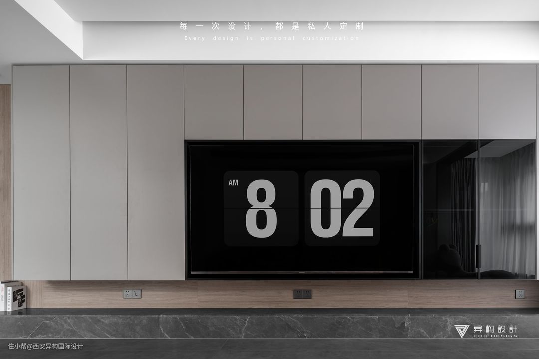 根据空间特性和屋主的生活方式,以现代设计理念营造出舒适的氛围。造型简单的电视背景墙凸显了空间的高级质感,整齐划一的平面柜体放大空间效果。