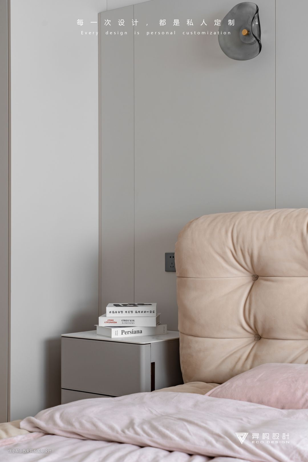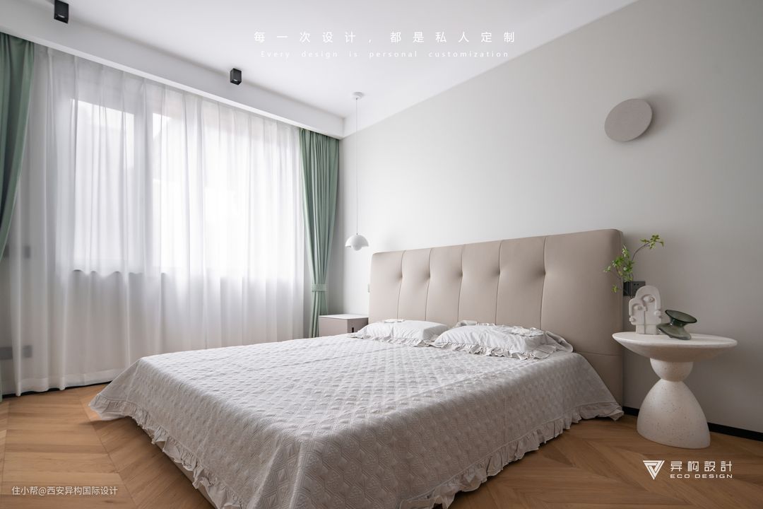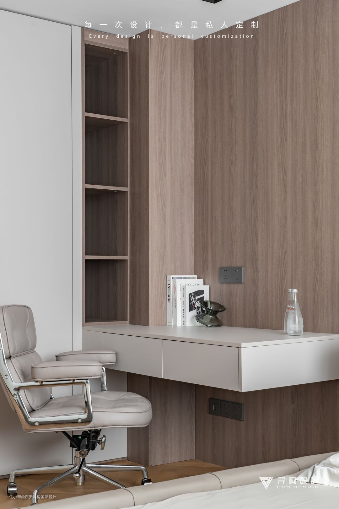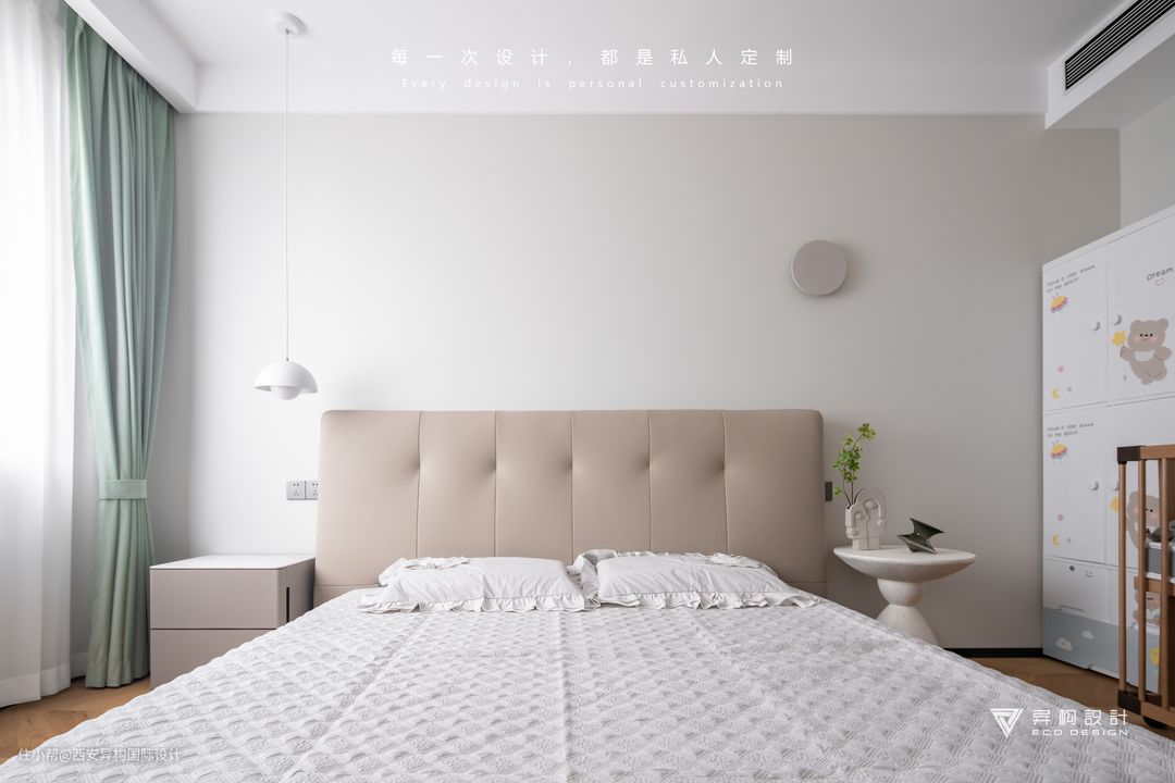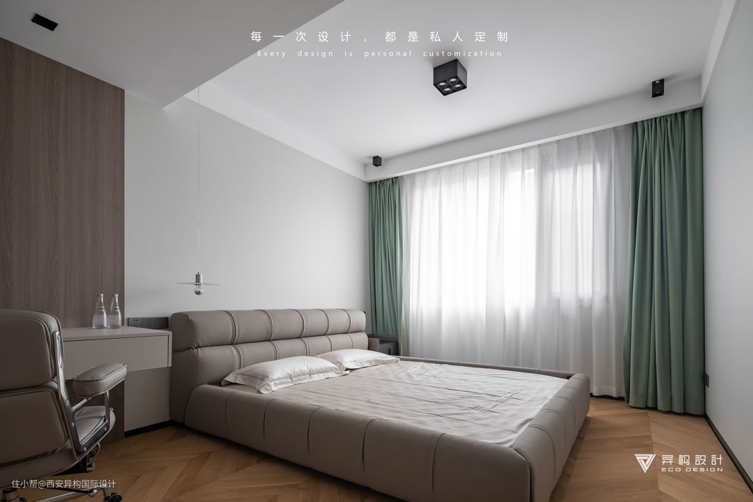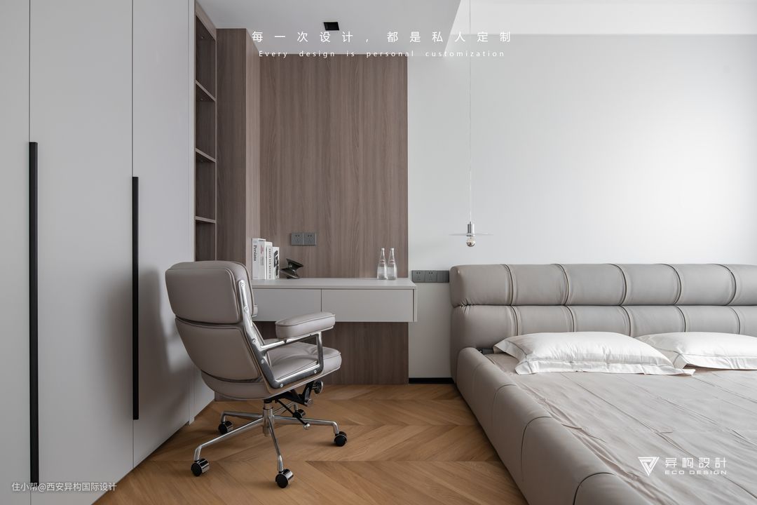 次卧在功能上做加法,视觉上做减法。统一的色调搭配为空间带来清爽舒适的感受。
