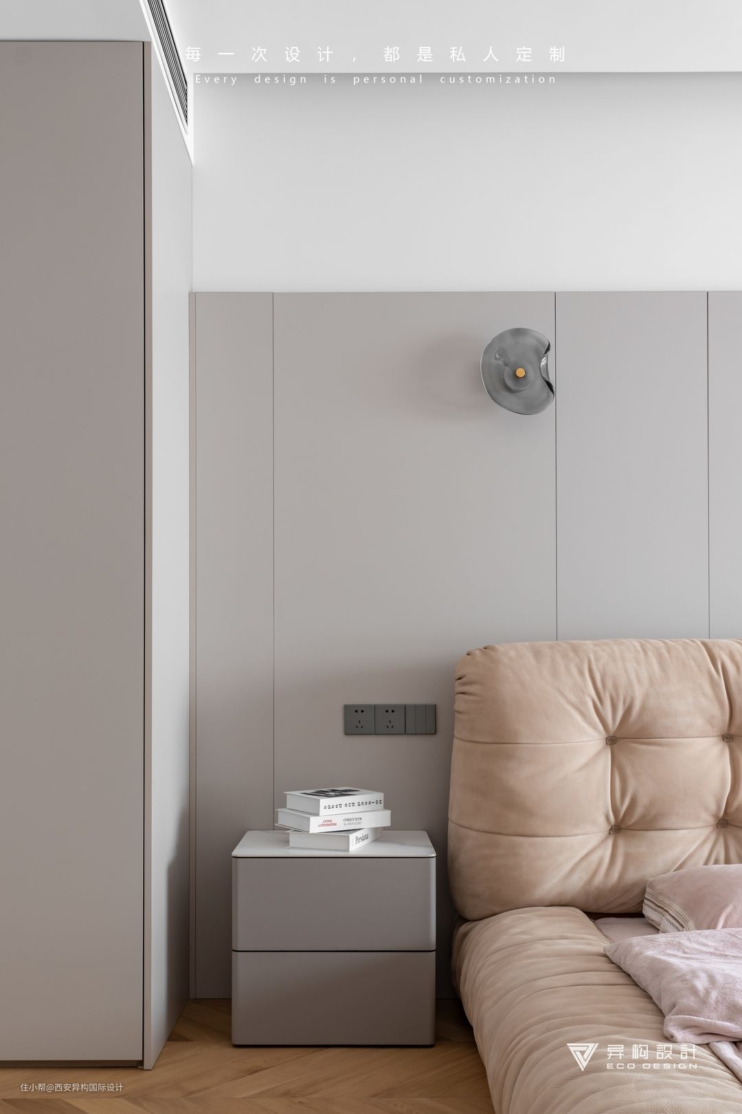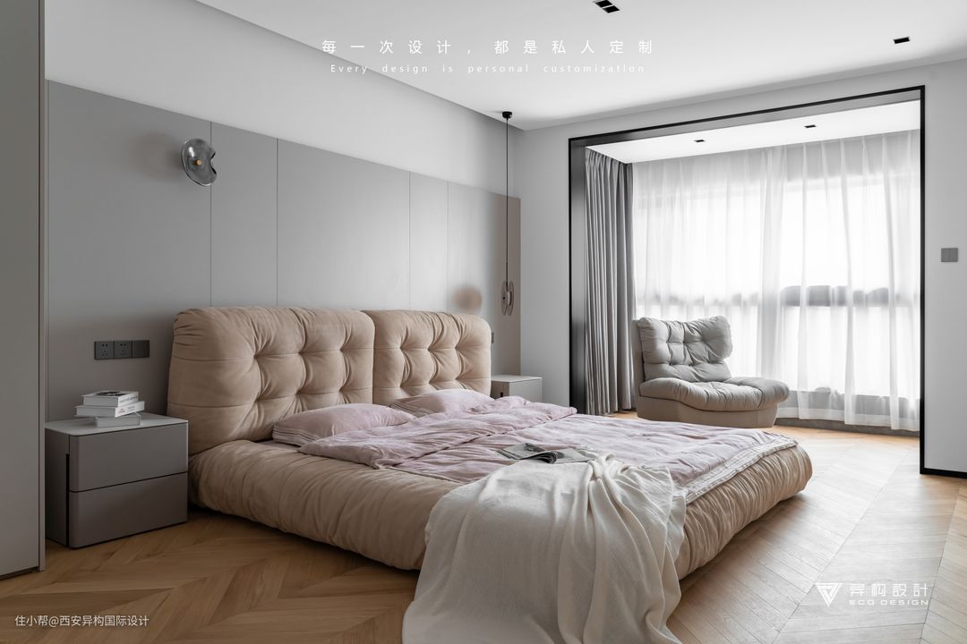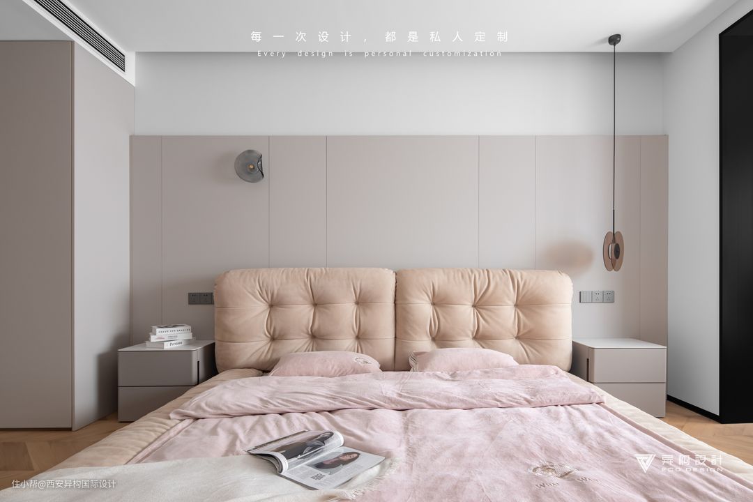 主卧的设计一览无余,色彩与材料的搭配使整体非常统一协调,床头一侧吊灯、一侧壁灯,少了静默与清冷,多了灵动与温馨。