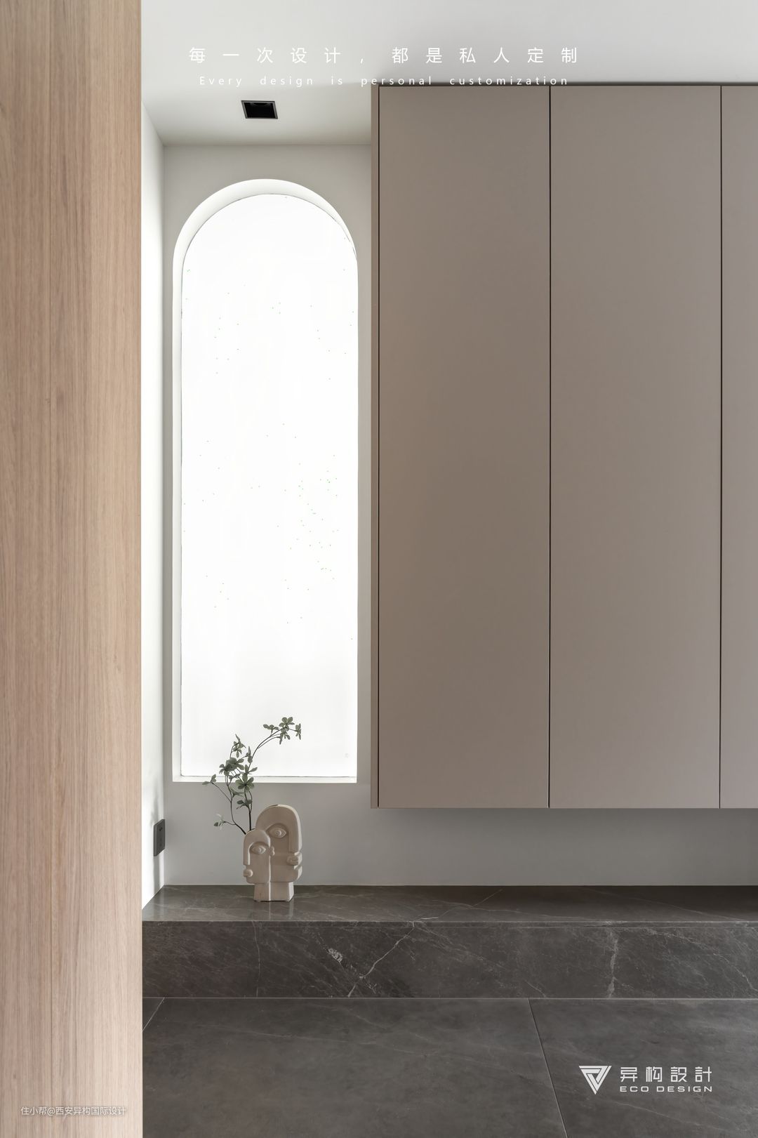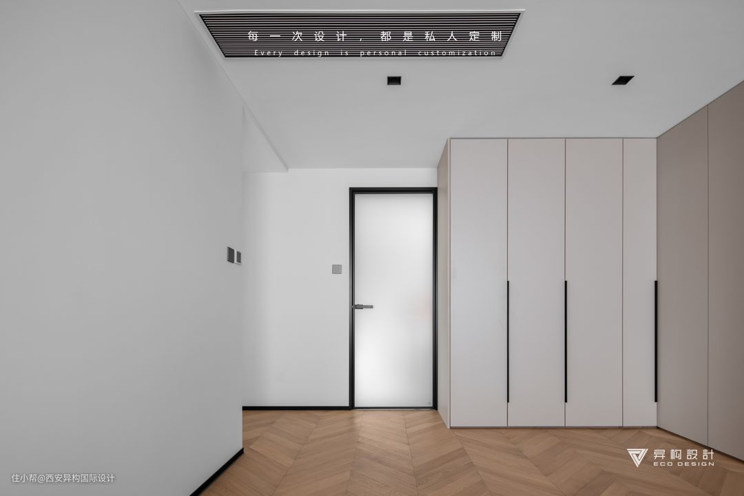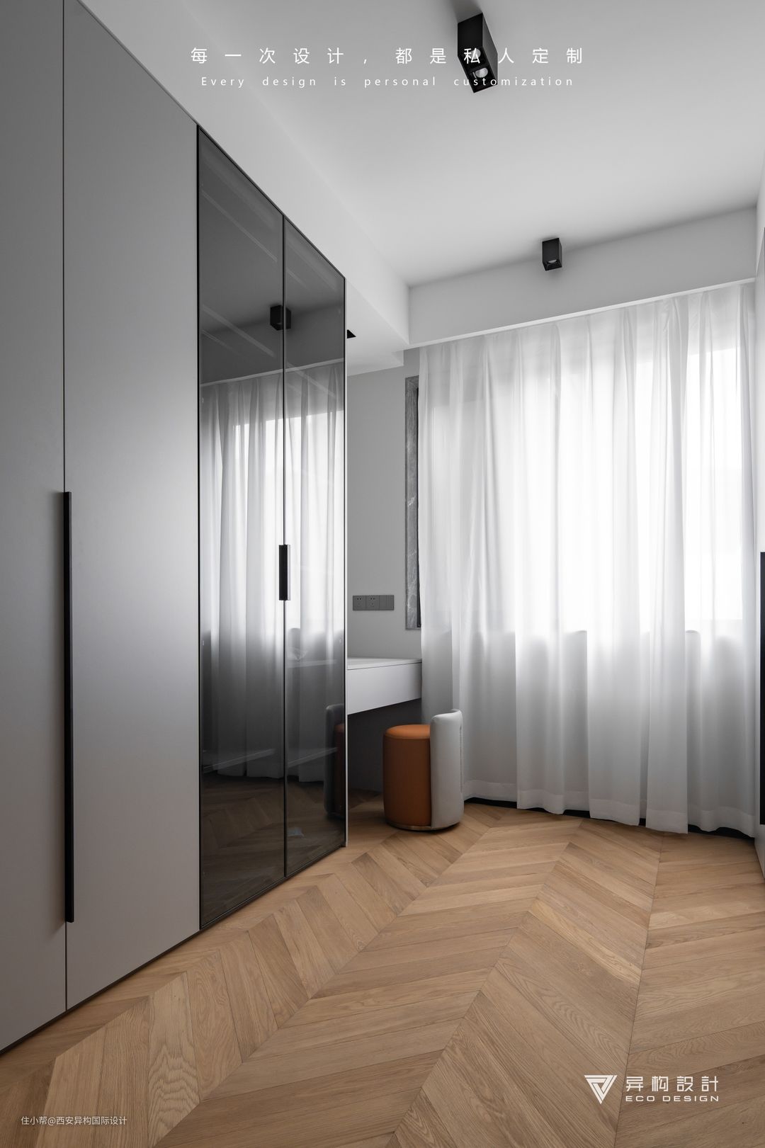 主卧的一旁设计了一个转角衣柜,用来放当季衣物。一门到顶的极简柜门,带了视觉上的享受。