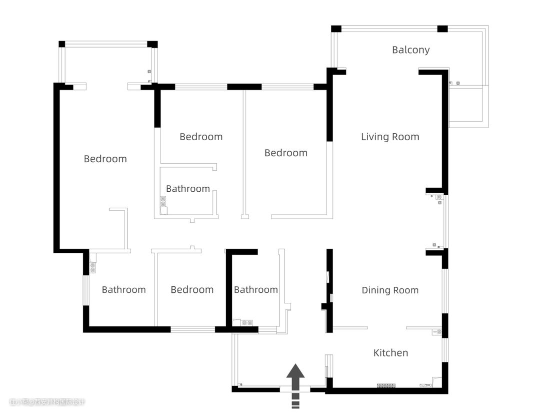 ● 平面布局图改造要点 ❶ 关闭厨房左侧入口,使入户动线简单清晰; ❷ 将厨房门洞外移,规划厨房、餐厅的功能布局; ➌ 将其中一间次卧纳入主卧空间,用作衣帽间使用。